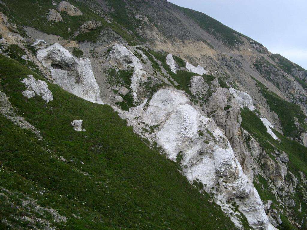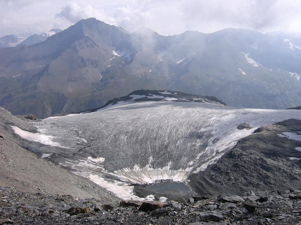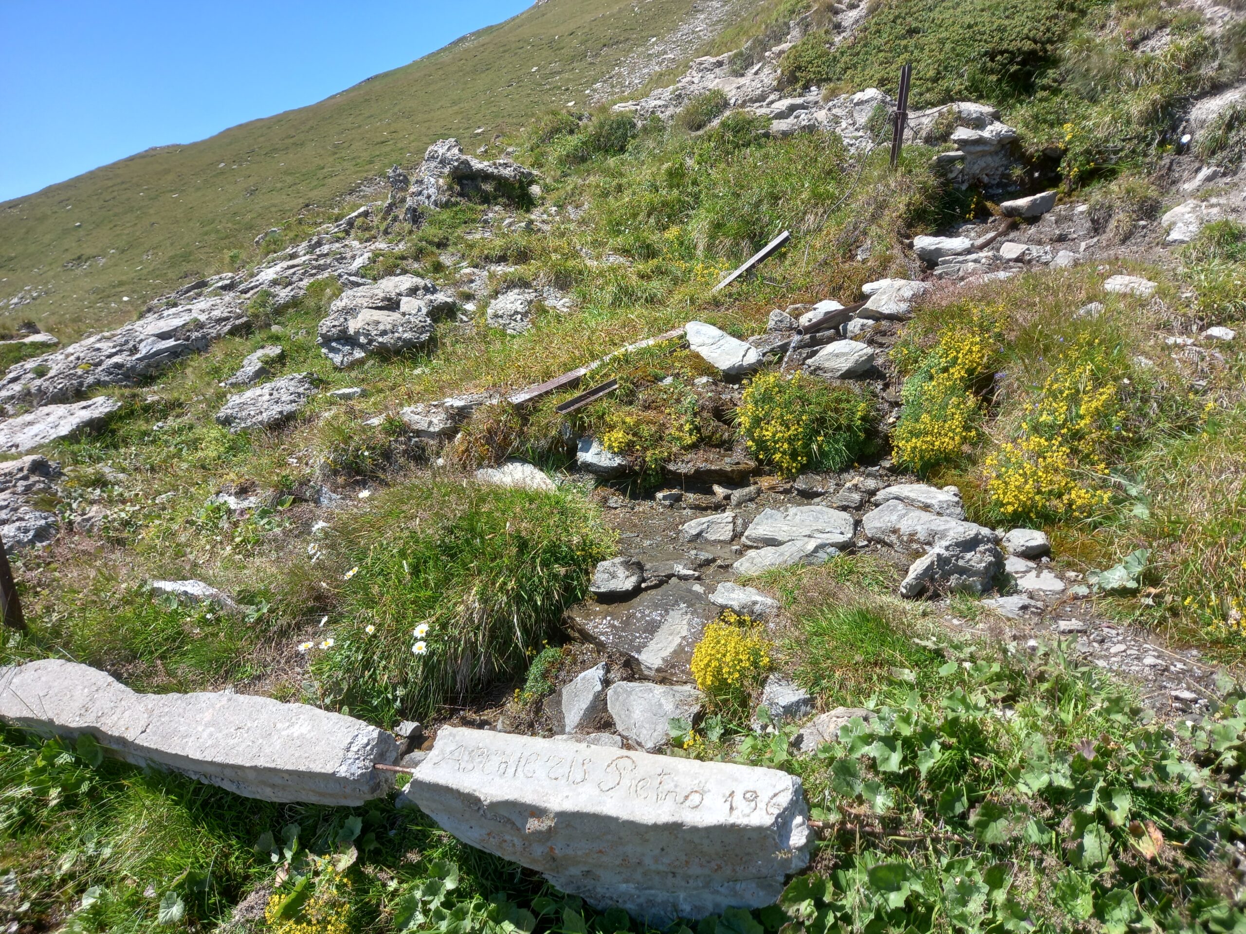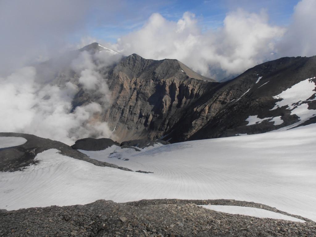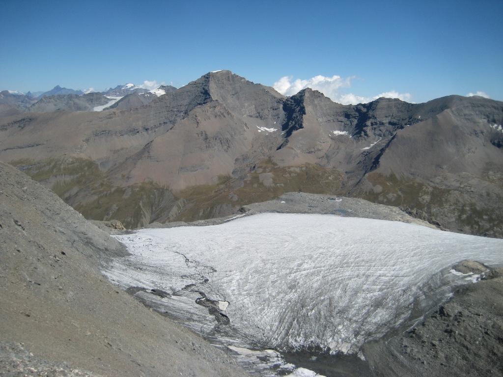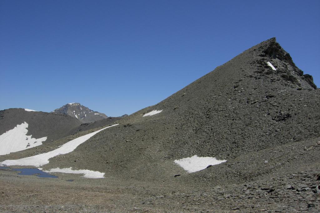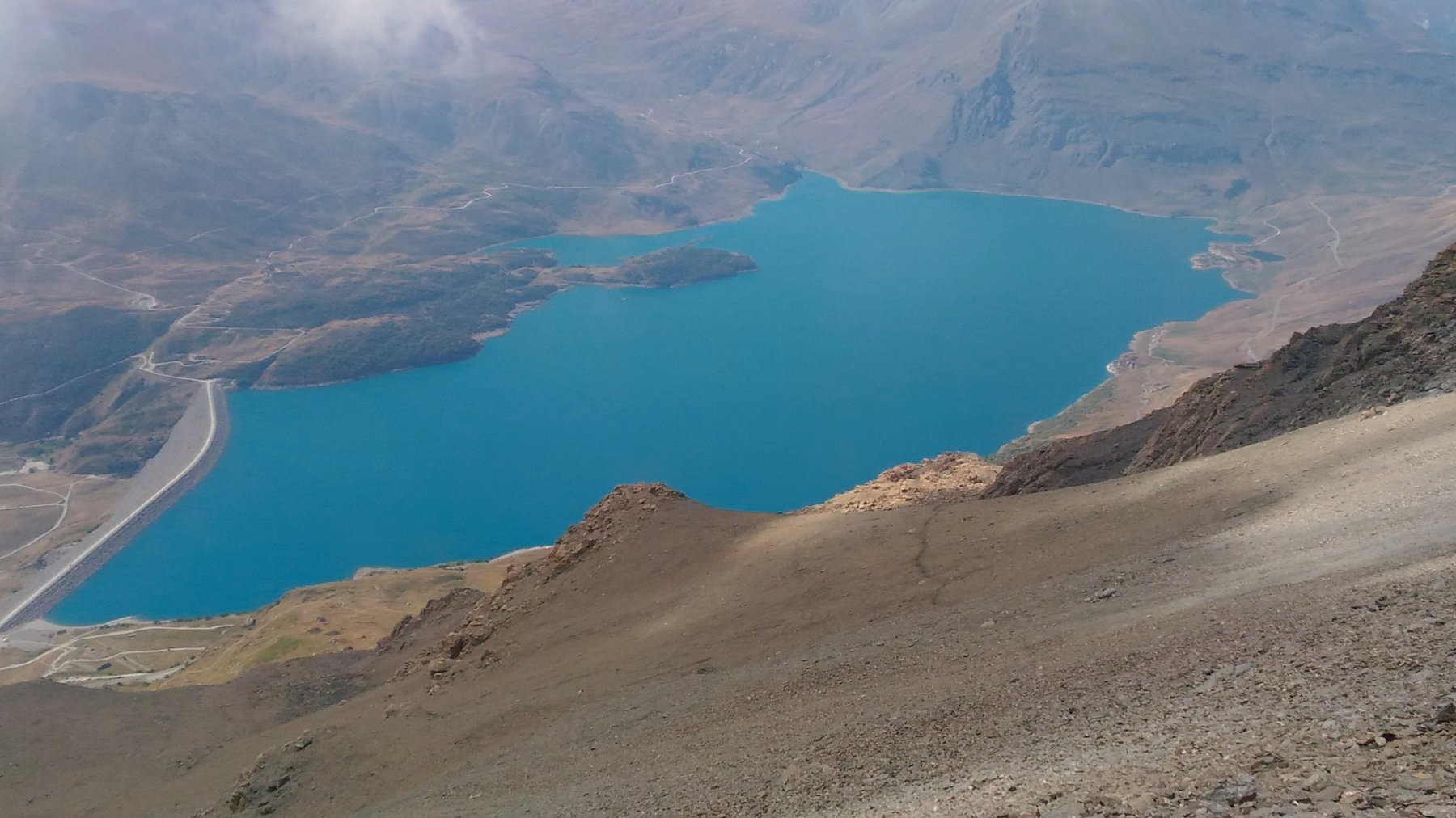 Sempre seguendo la mulattiera, o a piacimento tagliando i tornanti fuori traccia, si sale verso nord-ovest puntando alla sella dove sono presenti alcuni resti di fortificazioni a 2670 m. Il sentiero prosegue momentaneamente sul versante rivolto verso la diga del Moncenisio, toccando in breve una seconda casermetta a 2750 m. A questo punto proseguire sulla destra della casermetta, ritornando sul versante della montagna fin’ora percorso, seguendo la traccia abbastanza marcata tra magri pascoli e i primi affioramenti rocciosi. Ci si sposta quindi in pieno versante sud, e quando l’ambiente diventa completamente detritico si affronta un primo tratto molto ripido e faticoso, dove la vecchia mulattiera è ormai scomparsa, ed in particolare in un tratto si sale davvero con fatica su sfasciumi mobili e ripidi, seppur senza pericoli. Si prosegue in direzione di una barriera rocciosa, che si aggira abbastanza comodamente sulla destra, per poi sbucare su un pendio, sempre detritico, molto più dolce dove il sentiero torna più agevole. Si sale questo pendio, via via più ripido puntando ad uno stretto intaglio ben evidente, raggiungibile con un breve canalino anche qui molto ripido e di terreno friabile. Sbucati all’intaglio si apre il plateau di nevai e detriti 3430 m a breve distanza dal Signal du Lac (a sinistra) e sotto il Signal du Lamet a destra. Una traccia piuttosto evidente percorre a mezza costa il pendio ovest del Signal du Lamet (volendo una traccia prosegue sul crestone e permette di salire in cima 3483 m), e continua un po’ più labile e scoscesa sino alla piccola depressione tra Signal e Pointe du Lamet. Attenzione perchè qui nel 2017 si è verificato un imponente crollo del Signal du Lamet verso la Val Cenischia, che ha cancellato una parte di sentiero rendendo un breve passaggio un po’ aereo ma evitabile abbassandosi a sinistra. Prestare attenzione perchè il terreno continua a essere in movimento e si verificheranno ulteriori smottamenti.