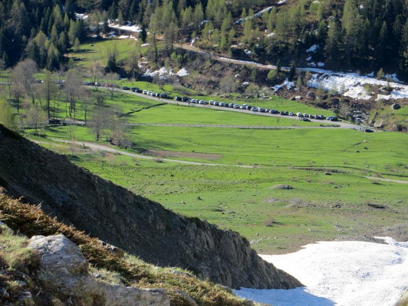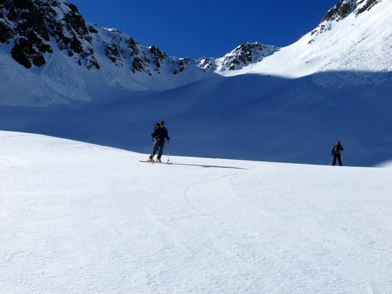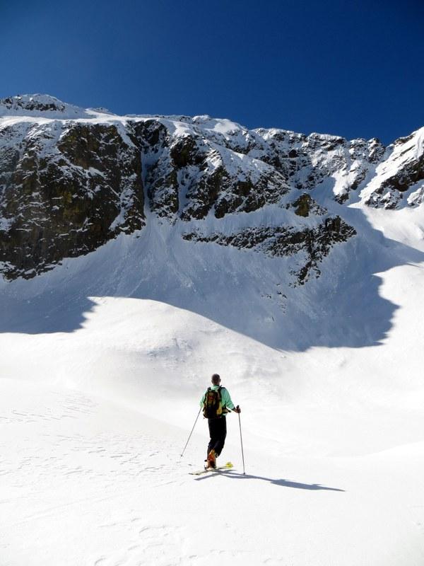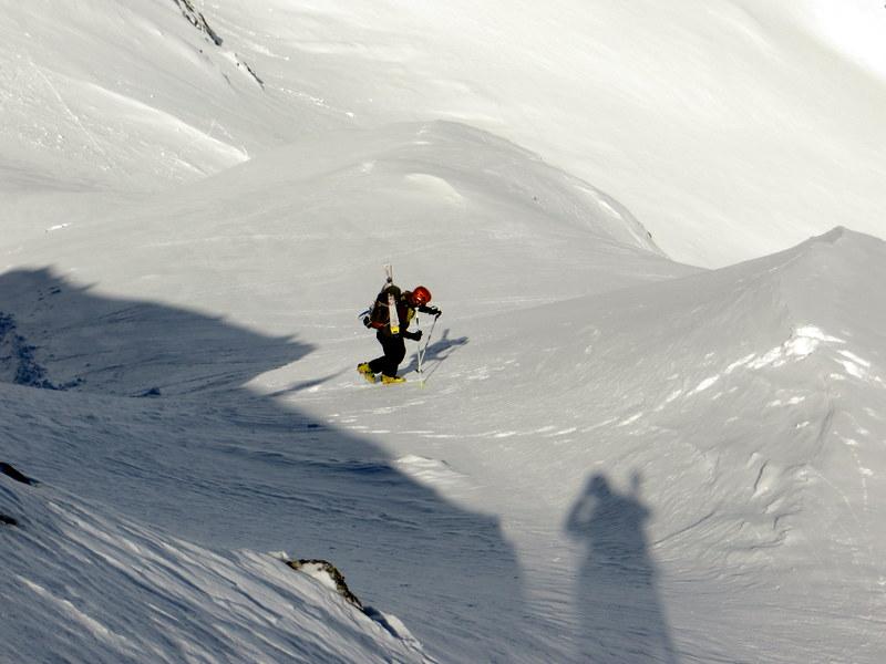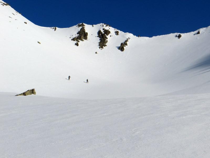 Discesa: spostandosi a destra ci si porta sull'ampio triangolo sommitale e si scia direttamente per circa 350 metri di aperto pendio. Se i canali inferiori non sono in condizioni ( verificare salendo) traversare decisamente a sinistra, appena sotto la fascia rocciosa, in direzione del colle Laroussa ed infine ricongiungersi al vallone di salita.
