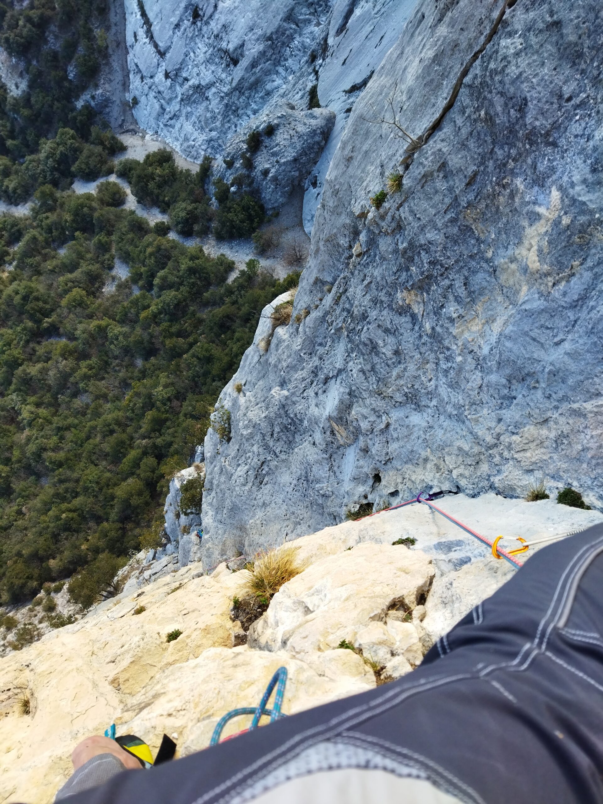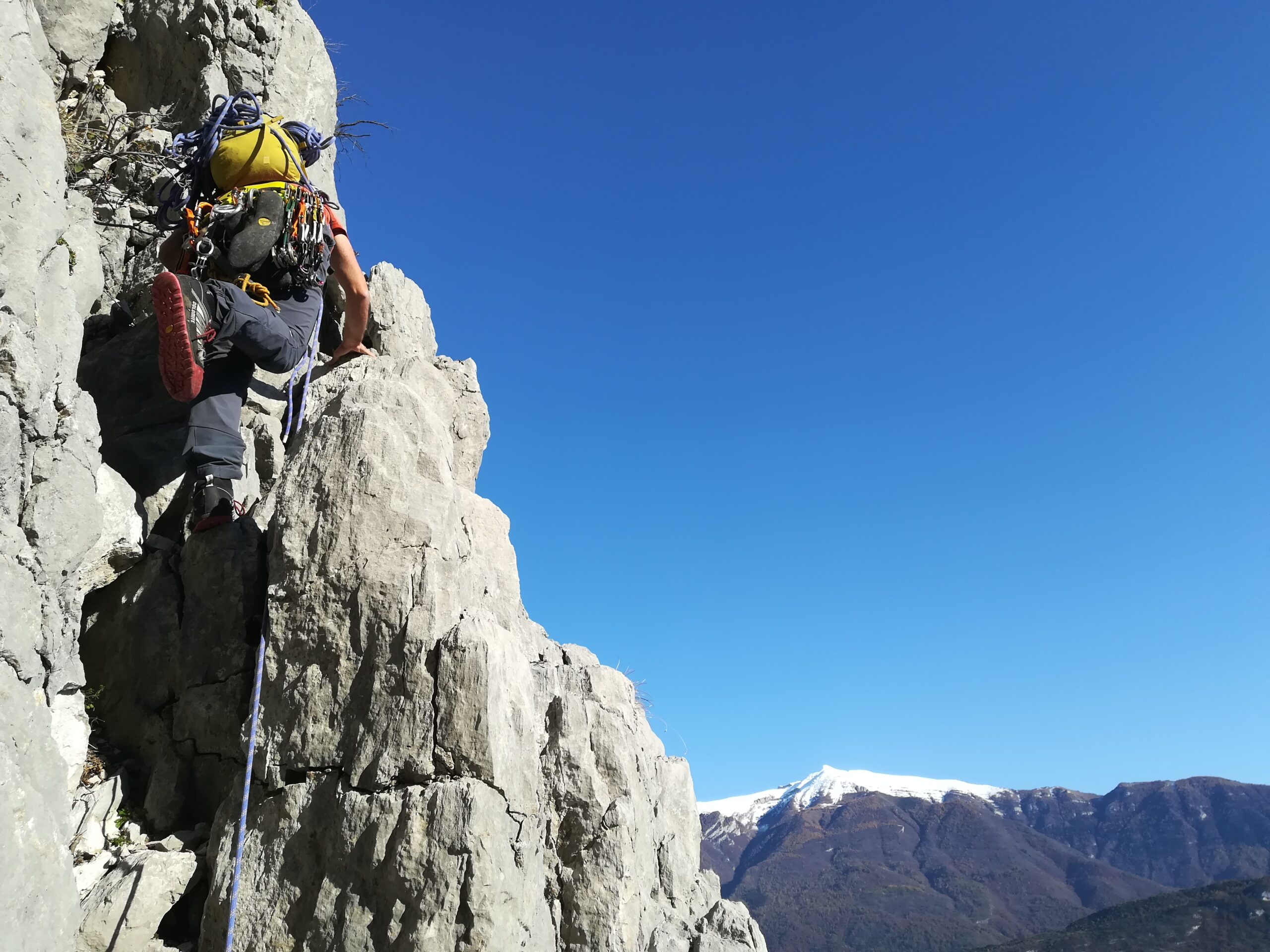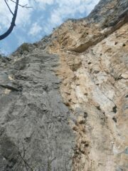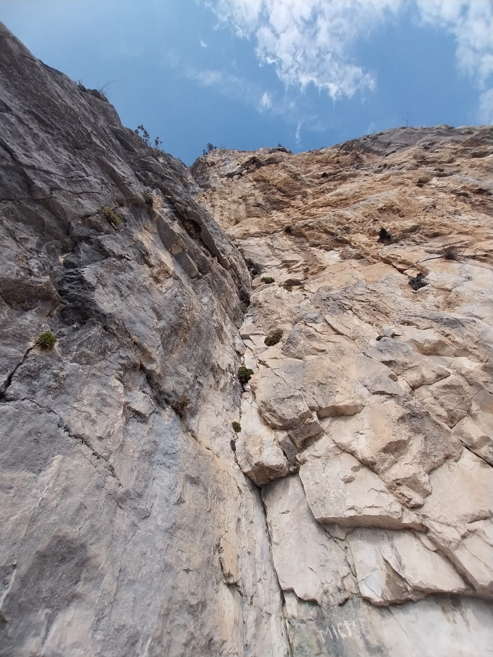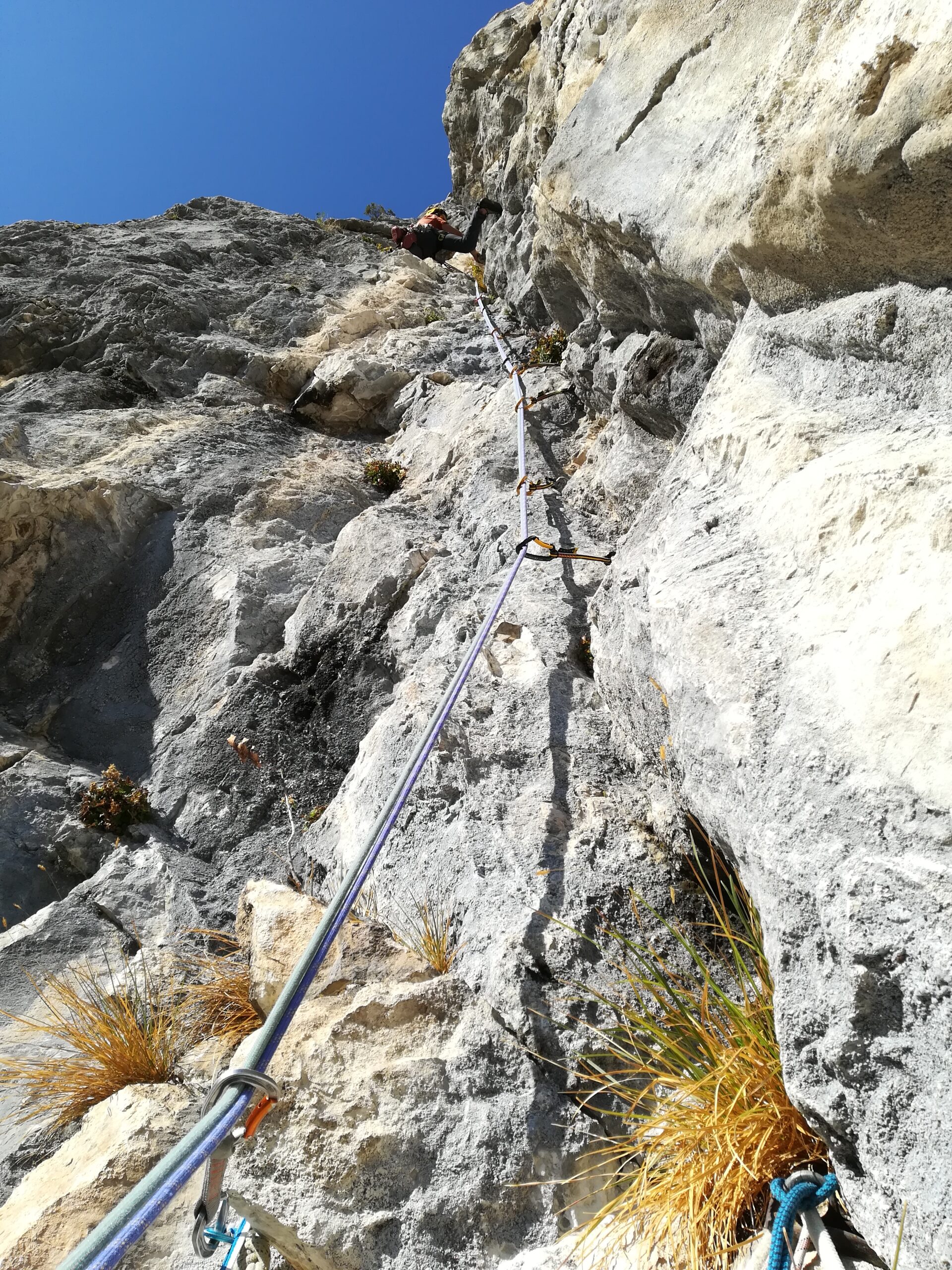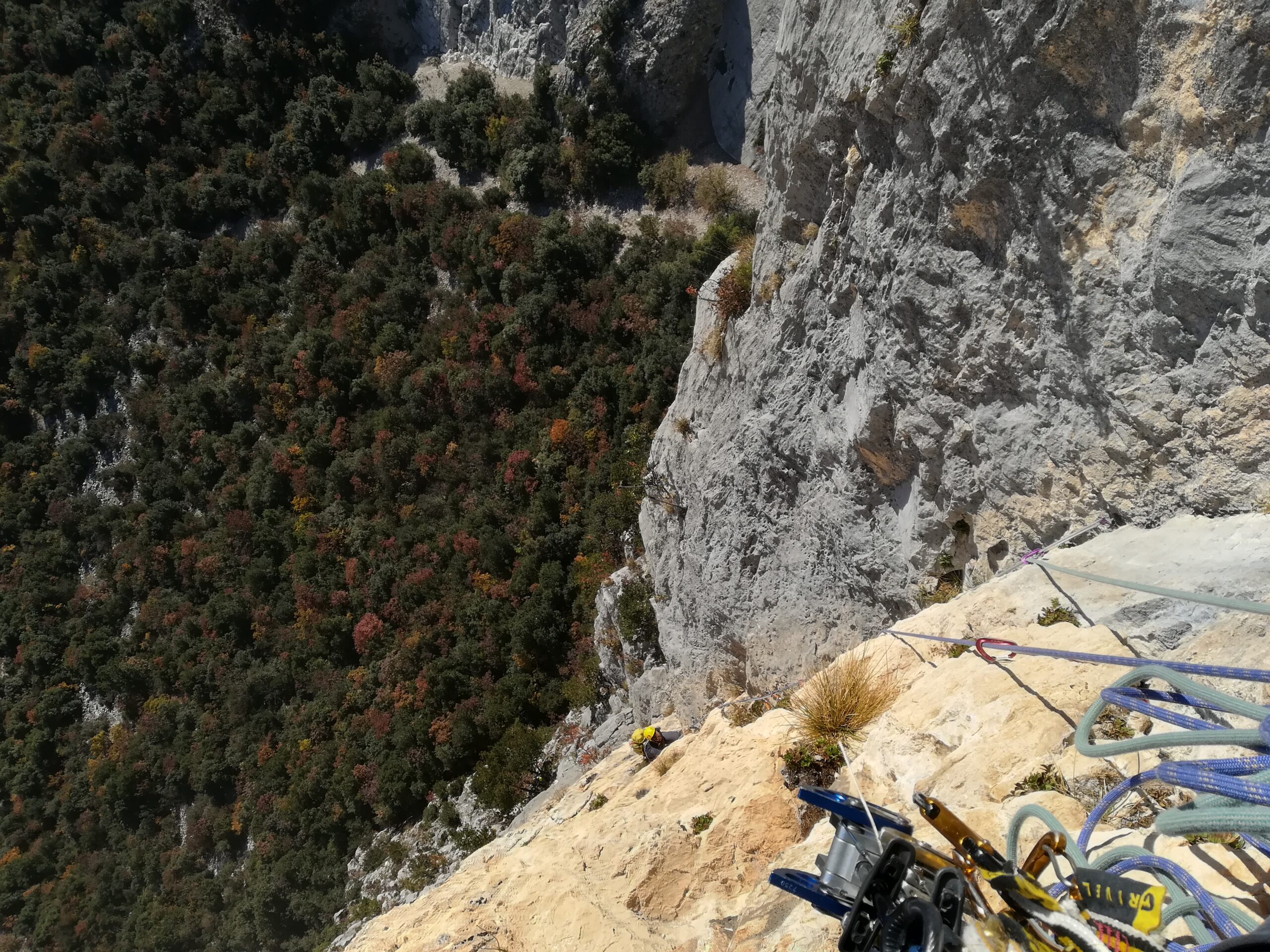 - L8: ancora lungo il diedro fino al tettino che lo chiude: uscire a destra (chiodo ballerino…), dunque sostare su pianta se si intende scendere in doppia; se invece si vuole scendere a piedi conviene proseguire sulla successiva paretina fessurata – occhio alla roccia che peggiora un po’ – e sostare su pianta sul successivo terrazzino, facendo attenzione a non fare cadere sassi con le corde durante le manovre, siccome finirebbero dritti nel diedro sottostante. V+, poi IV