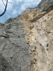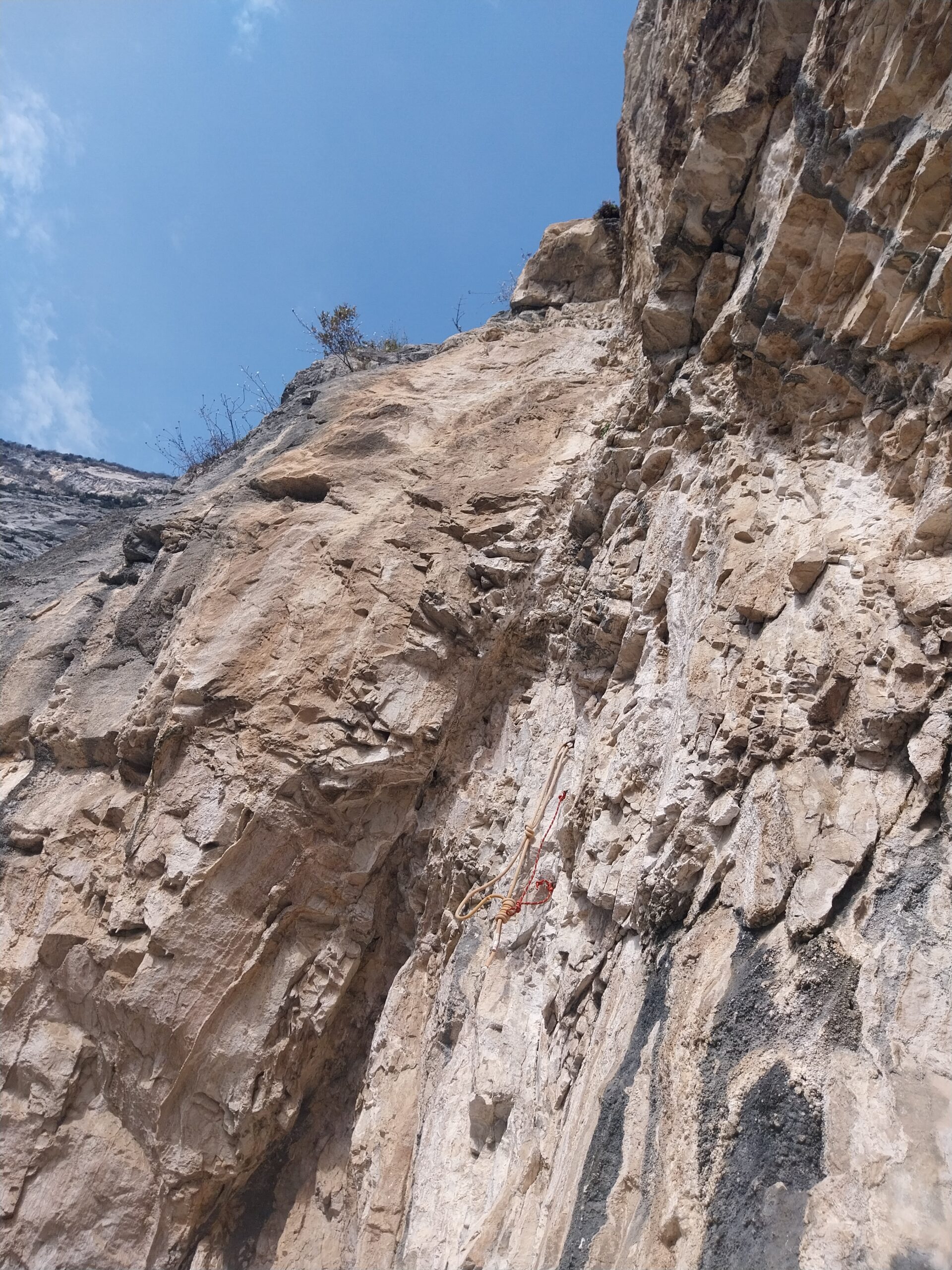 - L2: Diedro strapiombante faticoso, chiodato per l’A0. Uscita a sinistra su placchetta, eventuale sosta intermedia su clessidre, scomoda; ancora a sinistra poi dritti intercettando una via a spit. Sosta più a destra alla base di un diedro. A0, V+