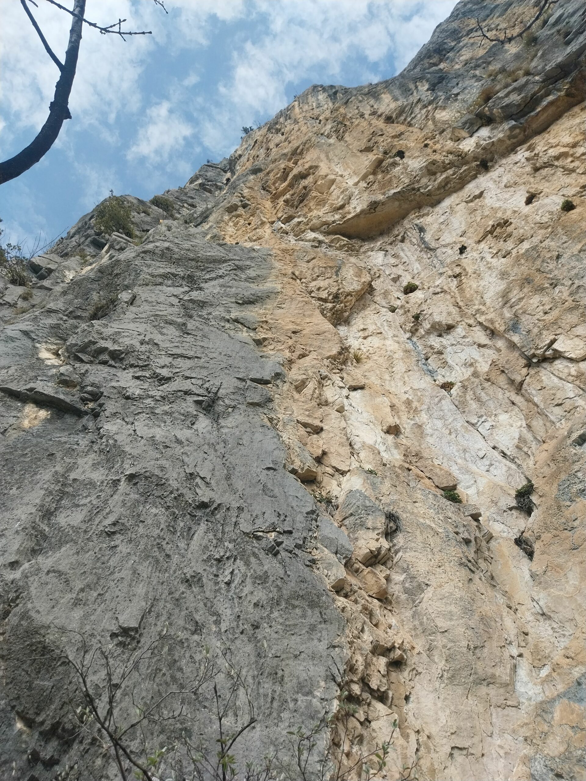 - L1: diedrino poi gradoni a destra fin sotto gli strapiombi. Presenti due soste vicine. IV