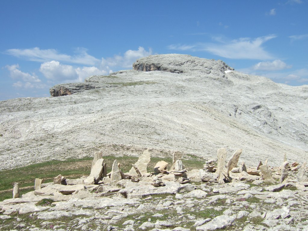 Dal parcheggio si sale in circa 25′ al rif. Città di Fiume sotto l’imponente parete del Pelmo. Salire ora alle spalle del rifugio per traccia nell’erba fino alla mulattiera che passando sotto il Col de la Puina, conduce a F.lla Col Roan. COn vari saliscendi si arriva tra ampi pascoli a Casera Prendera, chiusa, riparo di emergenza sotto lo stallone: il piccolo bivacco è stato chiuso, essendo di proprietà delle Regole di San Vito. Si risale in breve alla F.lla di Col Duro a fianco dell’omonimo monte erboso a sx e si traversa in lieve salita a F.lla Ambrizzola da dove si può calare al rif. Palmieri. Una lieve discesa e poi l’ultima salita a F.lla Formin, ultimo tratto ripido. Dalla forcella, ampia e ghiaiosa, ci si addentra nell’ altopiano/crestone che conduce ai Lastoi di Formin. Questo tratto è segnalato solo con ometti: bisogna fare attenzione con nebbia o neve ai grandi intagli della cresta che sprofondano strettissimi verso valle. Al di là della vetta, il monte Formin scoscende con una alta parete (non sporgersi…). Molto usato come gita scialpinistica fino a stagione avanzata. Circa 3,40 dalla partenza a seconda del passo.