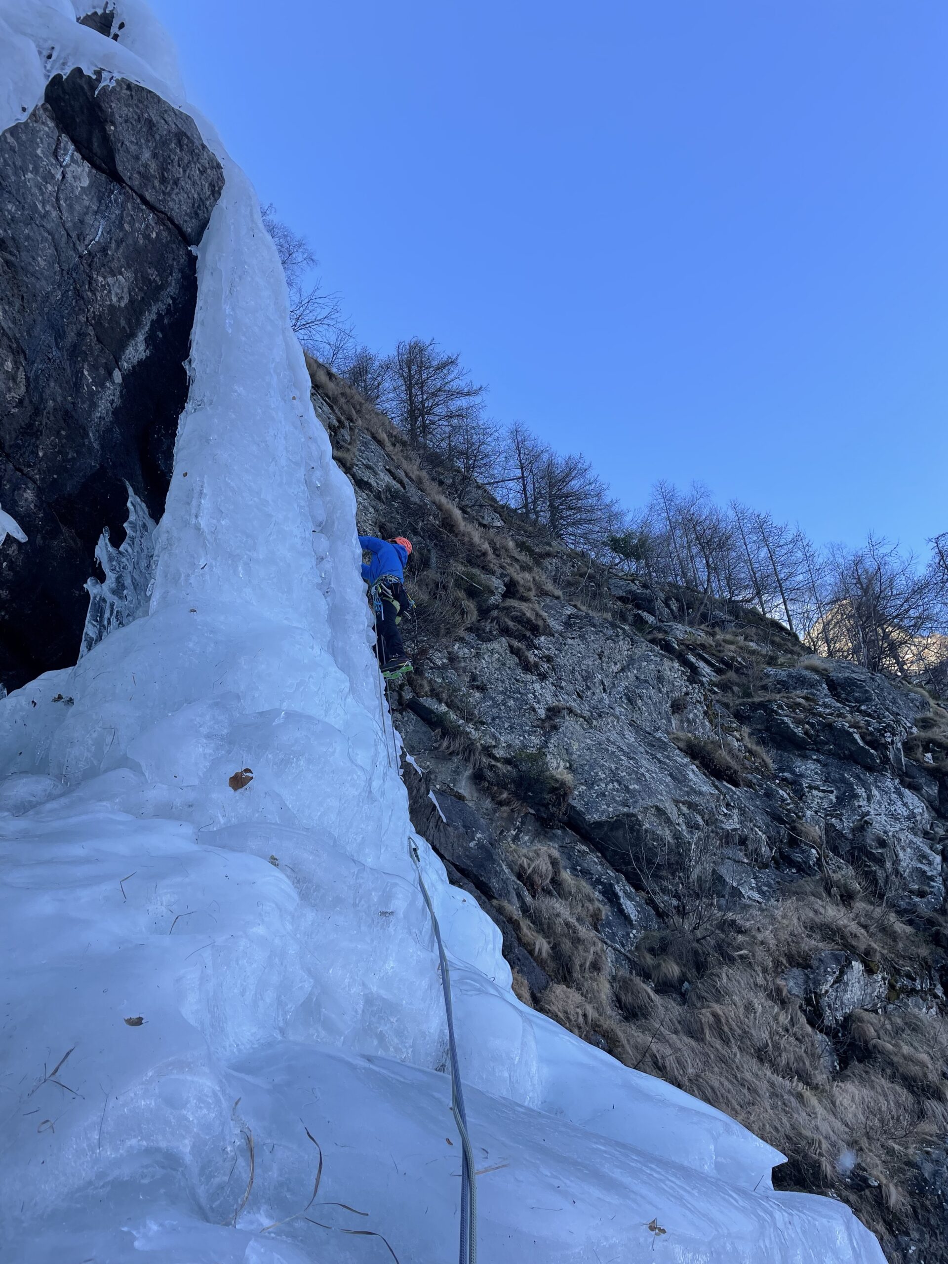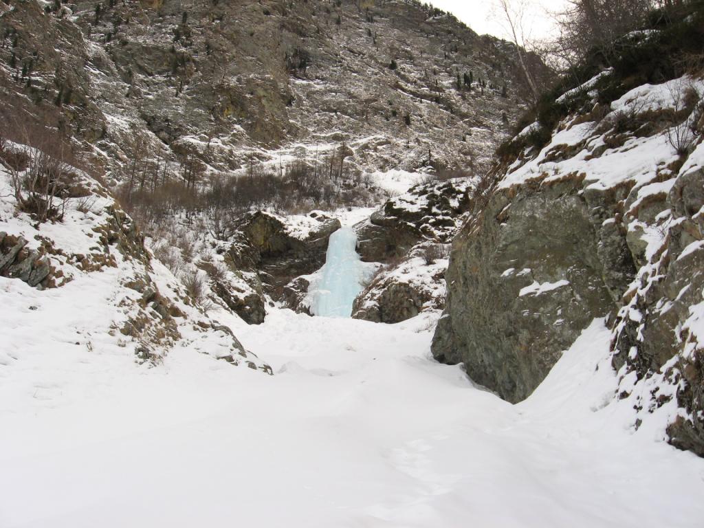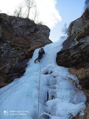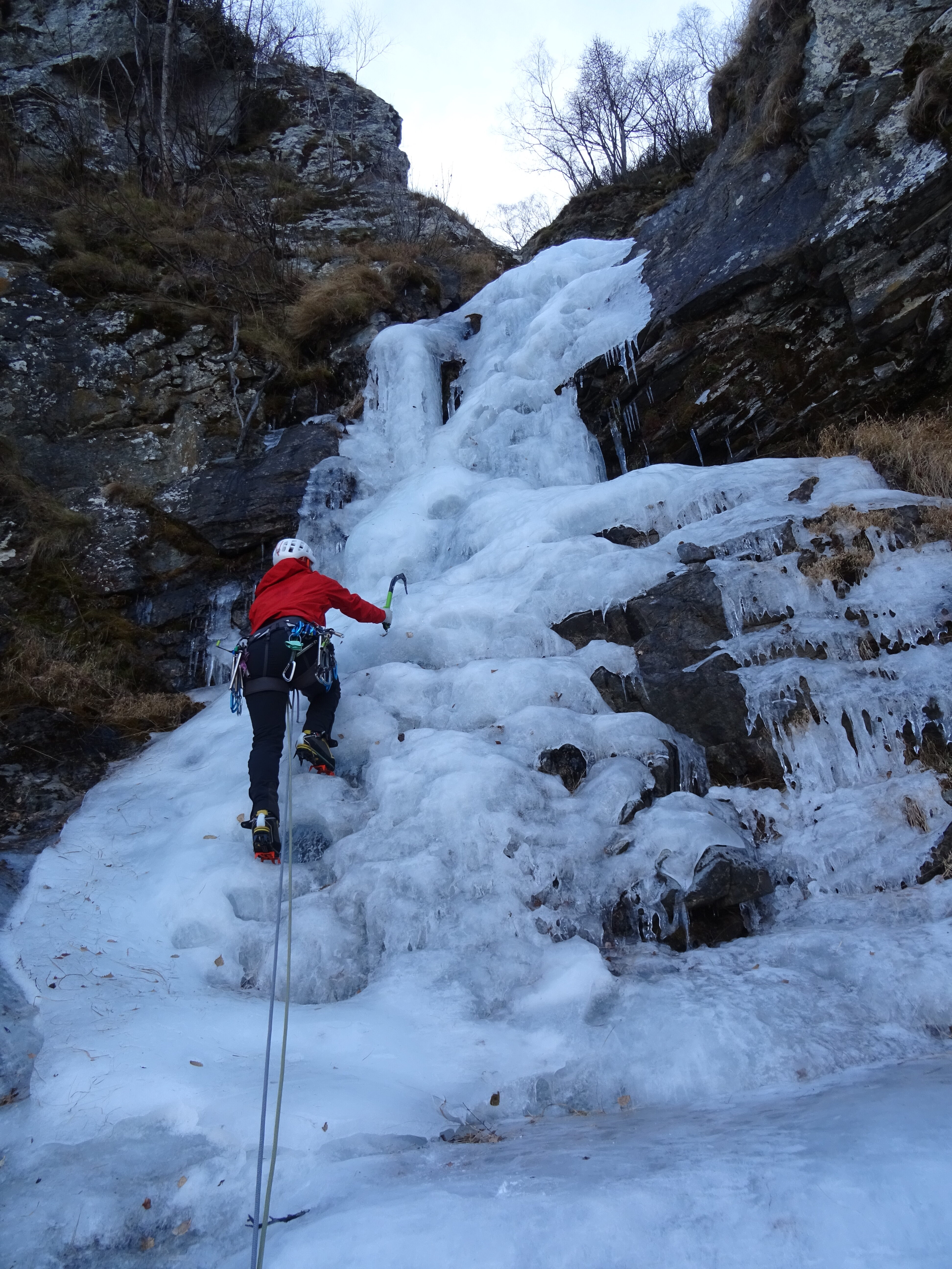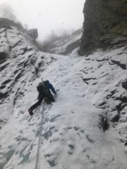 - L7: dopo un breve risalto e un trasferimento si sale un muro di una decina di metri con qualche metro a 75-80°, quindi dopo 60m si sosta su ghiaccio (WI 2+).