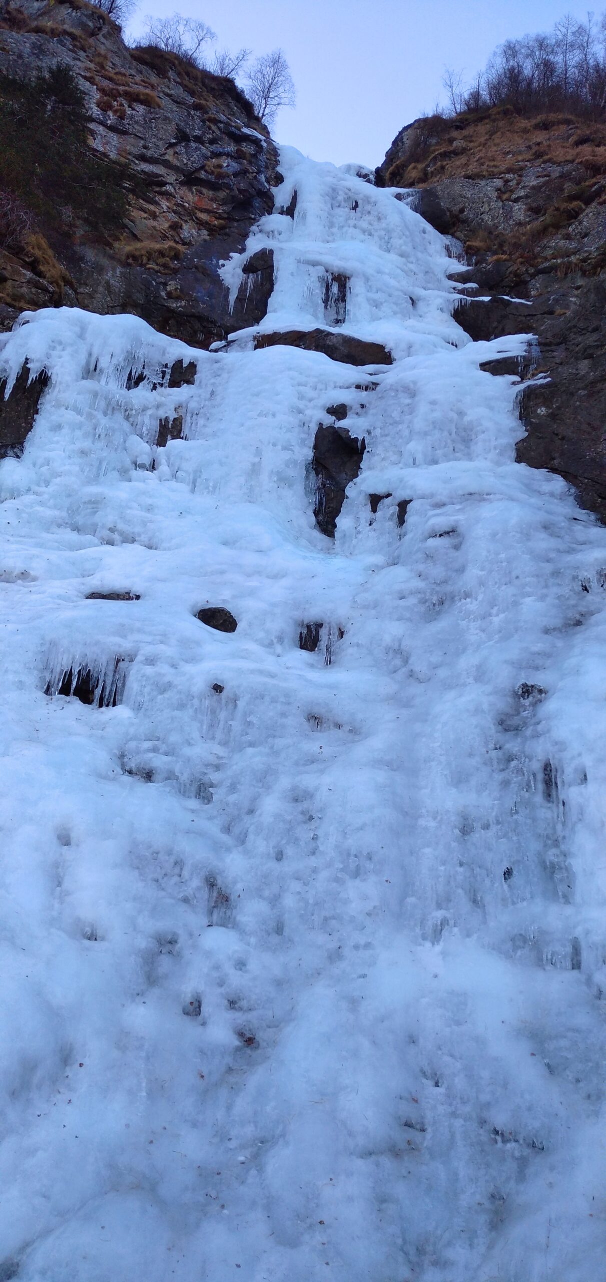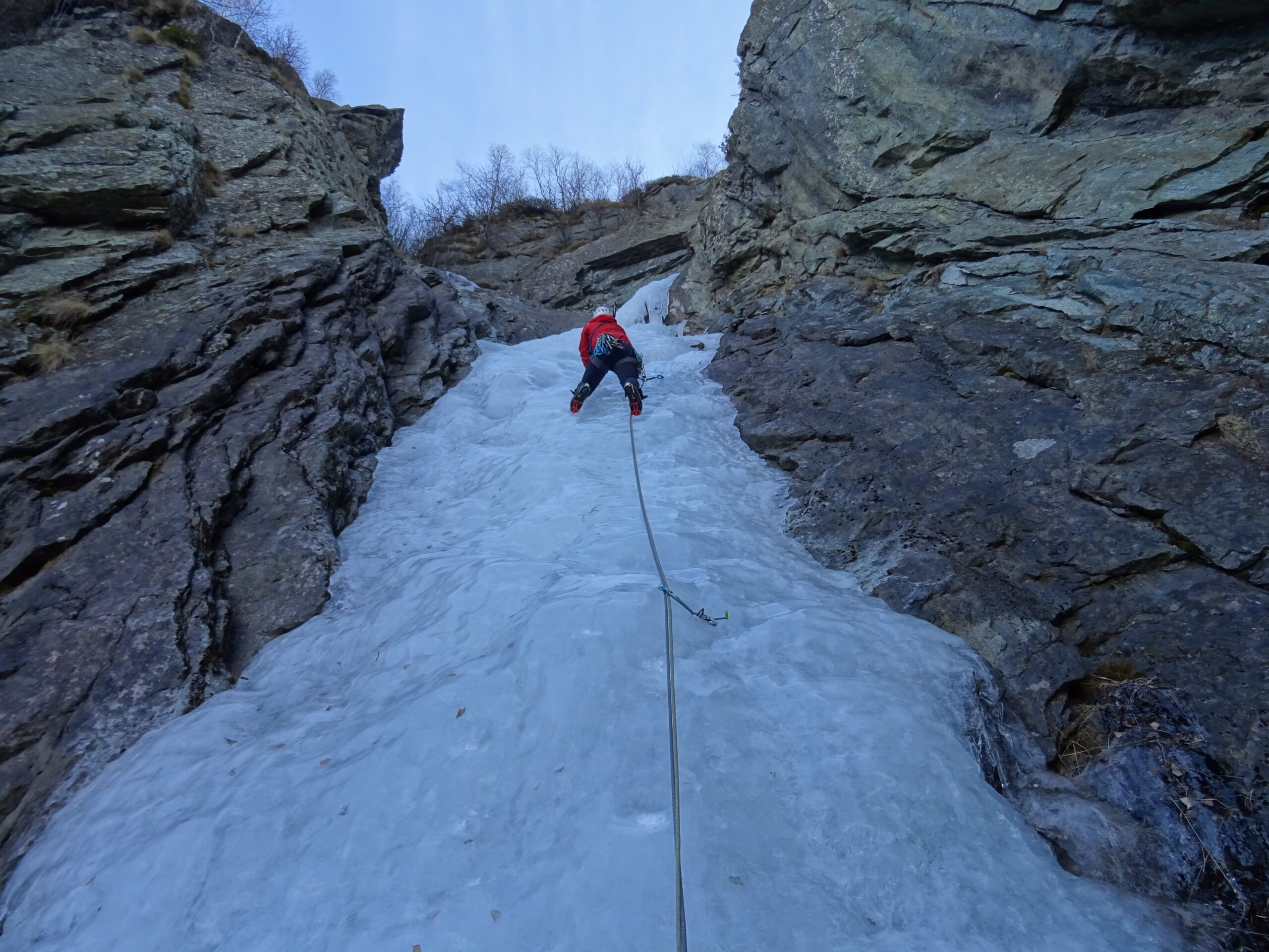 - L6: un breve trasferimento seguito da un corto muretto porta alla base di una larga colata. Salirla con un lungo tiro, 55m, che da metà devia a dx mantenendo sempre pendenze tra i 70-75° (WI 2/2+).