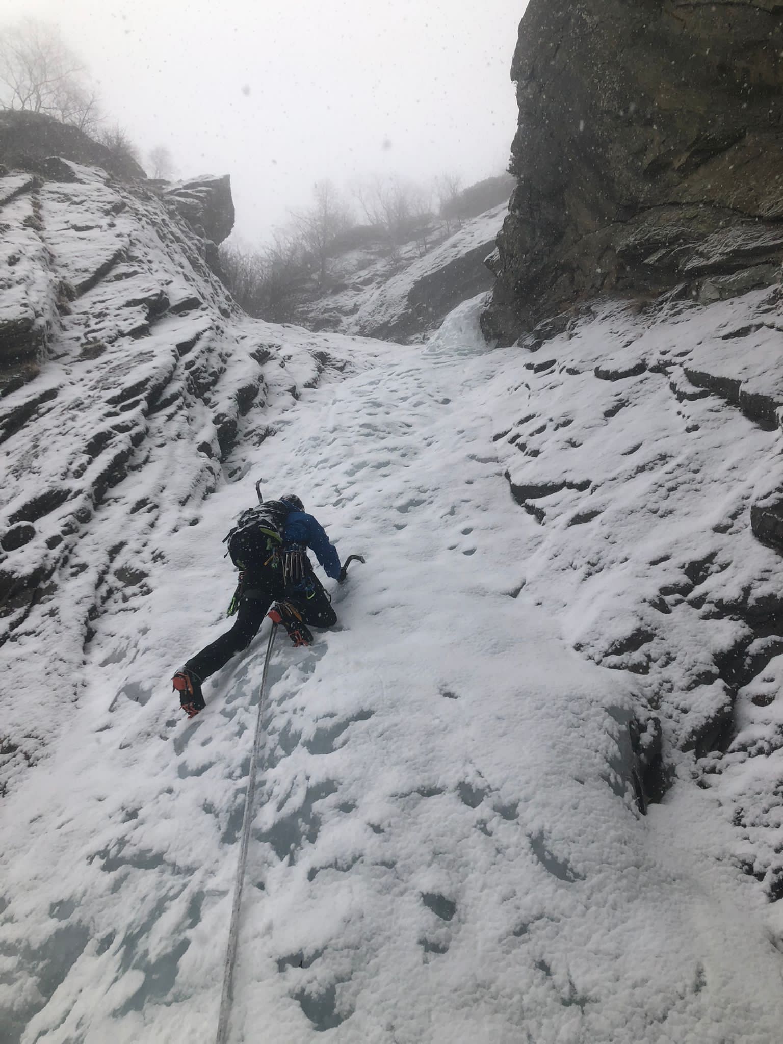 - L10: dopo un breve trasferimento salire l’ultimo risalto di ghiaccio facile (70°, WI 2, 55m).