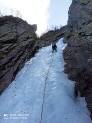 - L2: breve traverso esposto, quindi primo colonnino ripido (qualche metro a 90°), ripiano e secondo muro impegnativo (85-90°). Sosta a sx su ch.+fix (cordini gialli ben visibili), difficile da raggiungere con poco ghiaccio/neve. 45m, WI 3+.