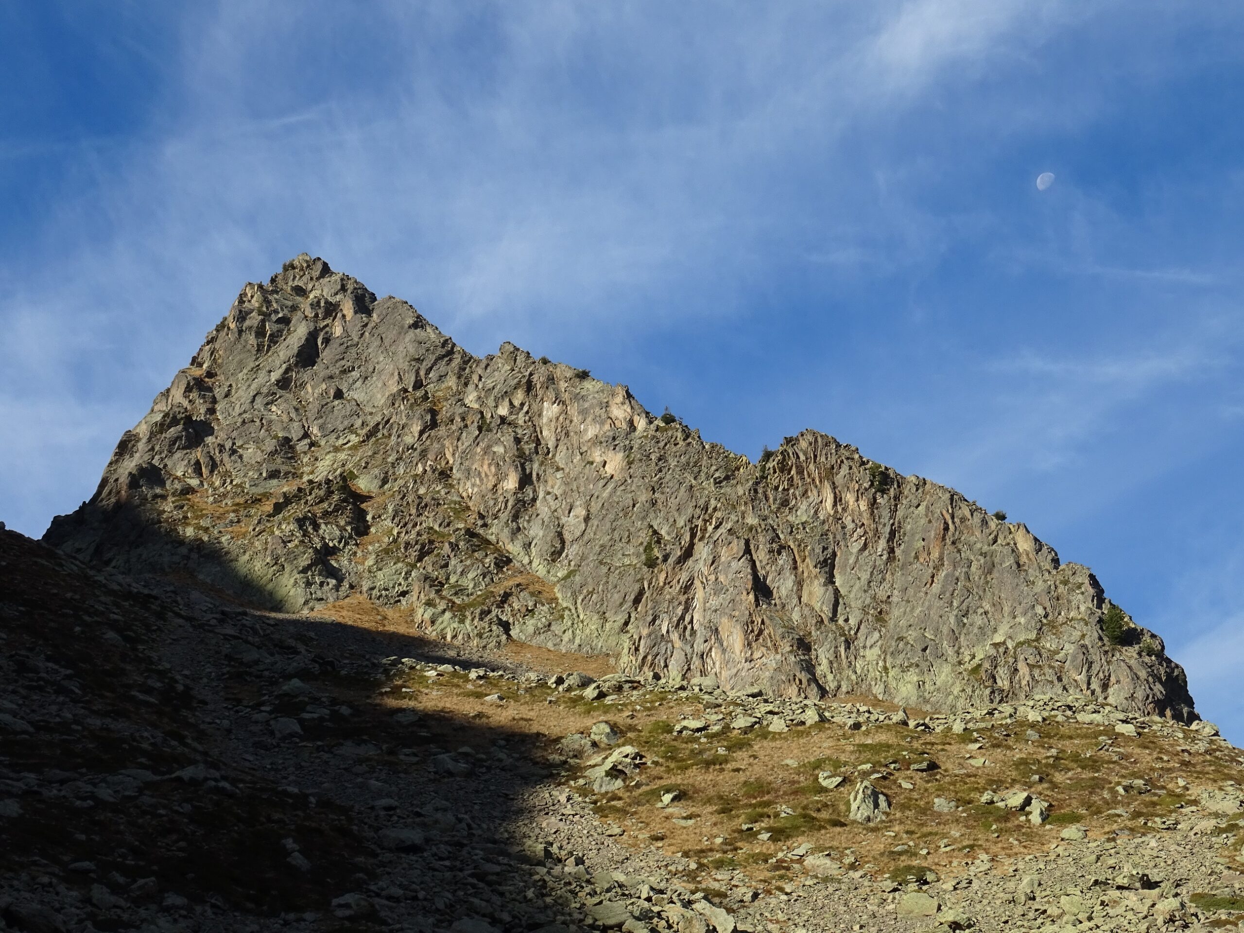 Si attacca ora l’ultimo tratto che presenta un salto quasi verticale superabile sfruttando una fessura (IV) o poco a fianco (roccia molto lichenata). Il tratto è aggirabile passando pochi metri sul lato sx (sud) per placche e blocchi più facili ma un po’ instabili. In breve si raggiunge il grande segnale di pietre della cima ben visibile dalla piana del rifugio.