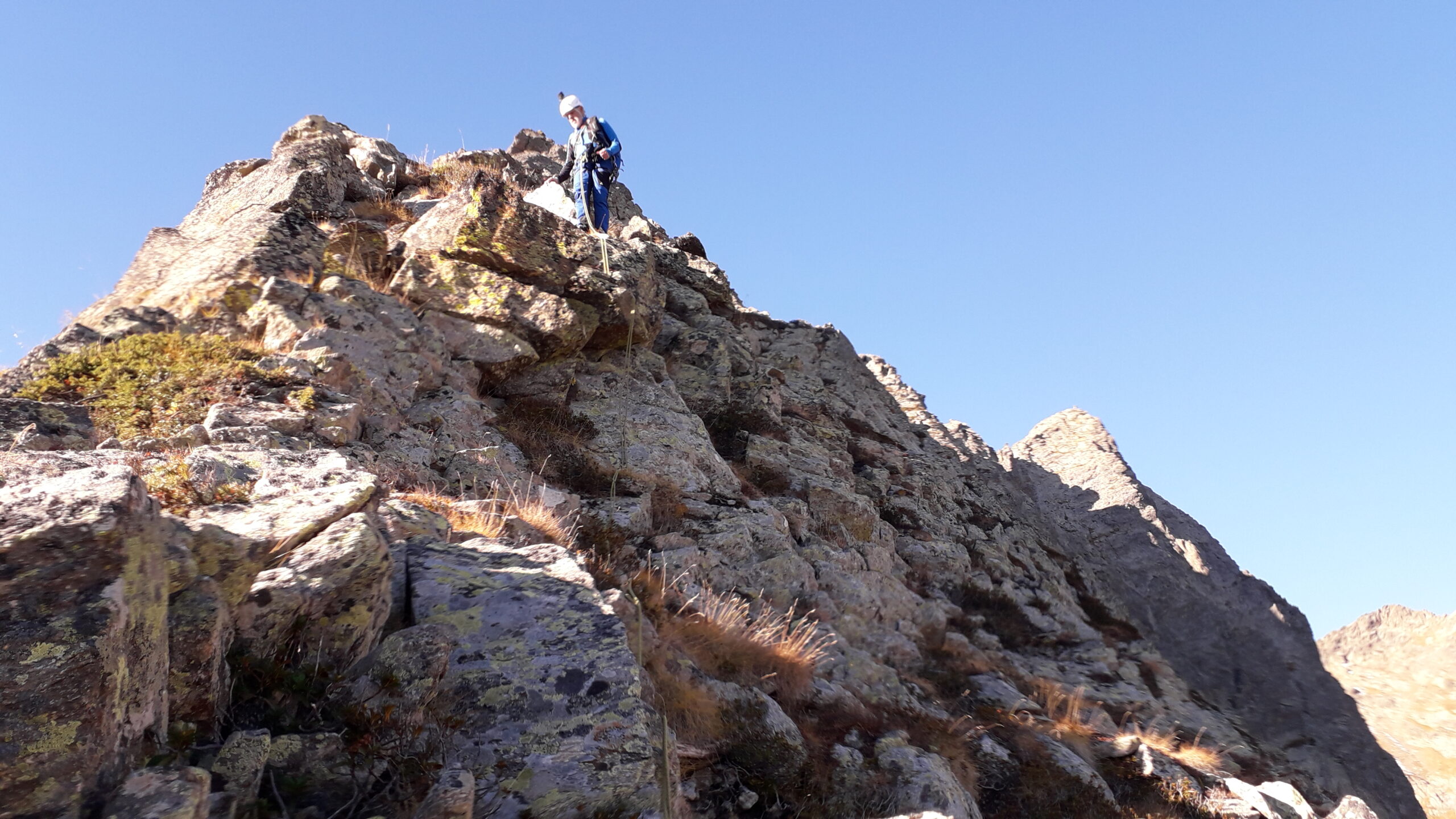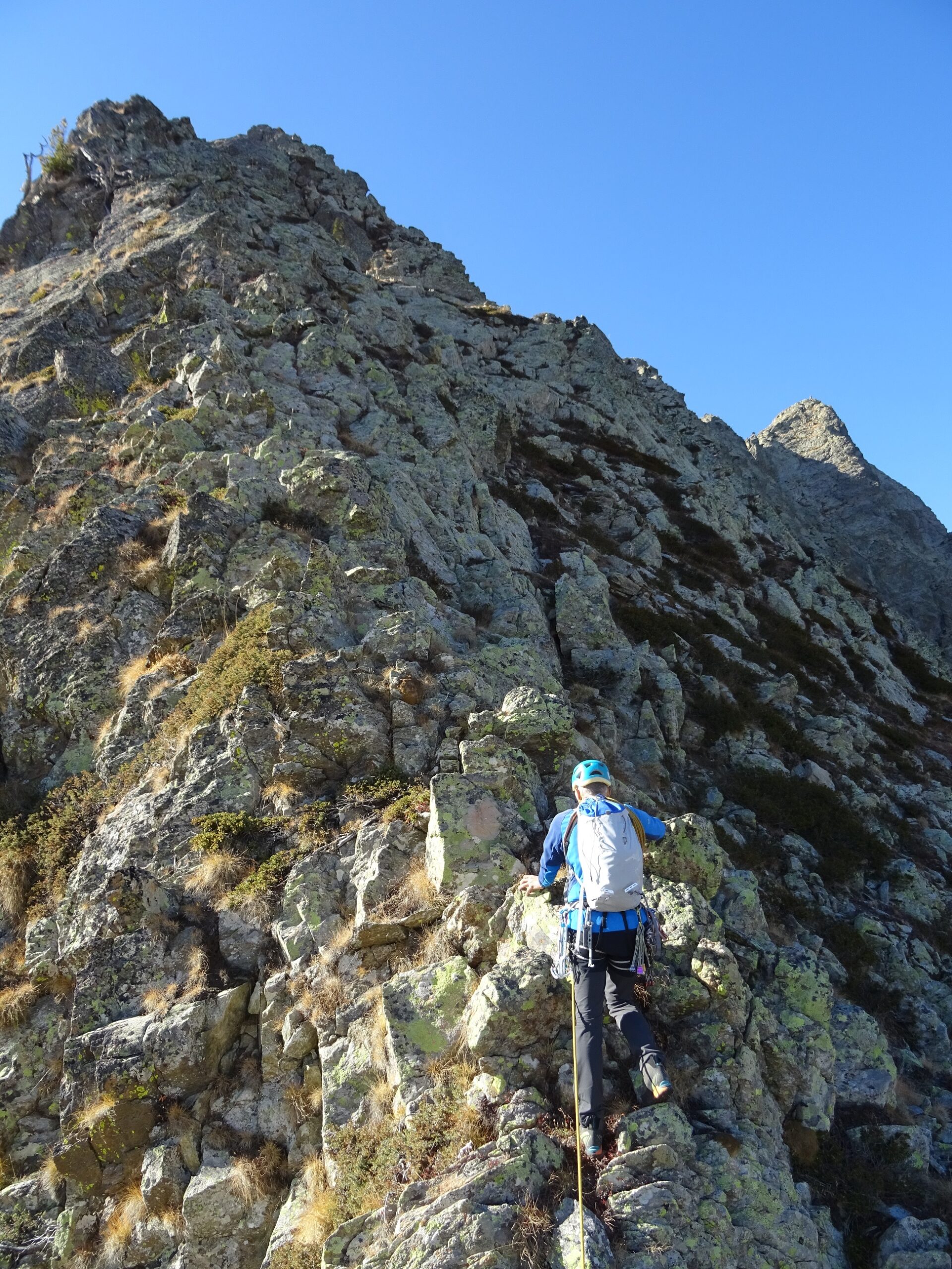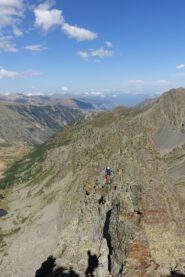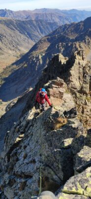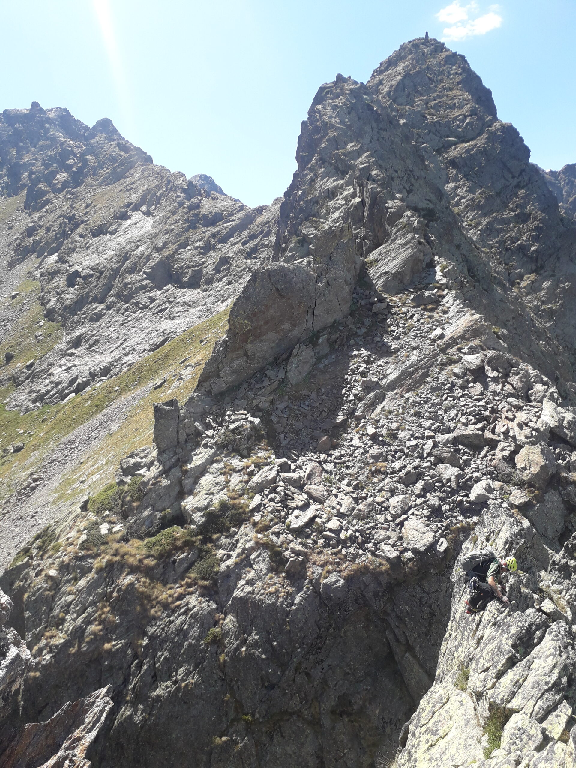 Segue un lungo tratto più affilato ma mai particolarmente esposto e il superamento di una serie di torrioni (II qualche passo di III, tratti di II+ in discesa). I più grandi si superano sul filo, i gendami più piccoli si aggirano lato nord. In cima all’ultimo torrione si trova una sosta a cordoni per una calata di 25 m fino alla forcella successiva (anello di corda per una sosta intermedia dopo 15m).