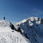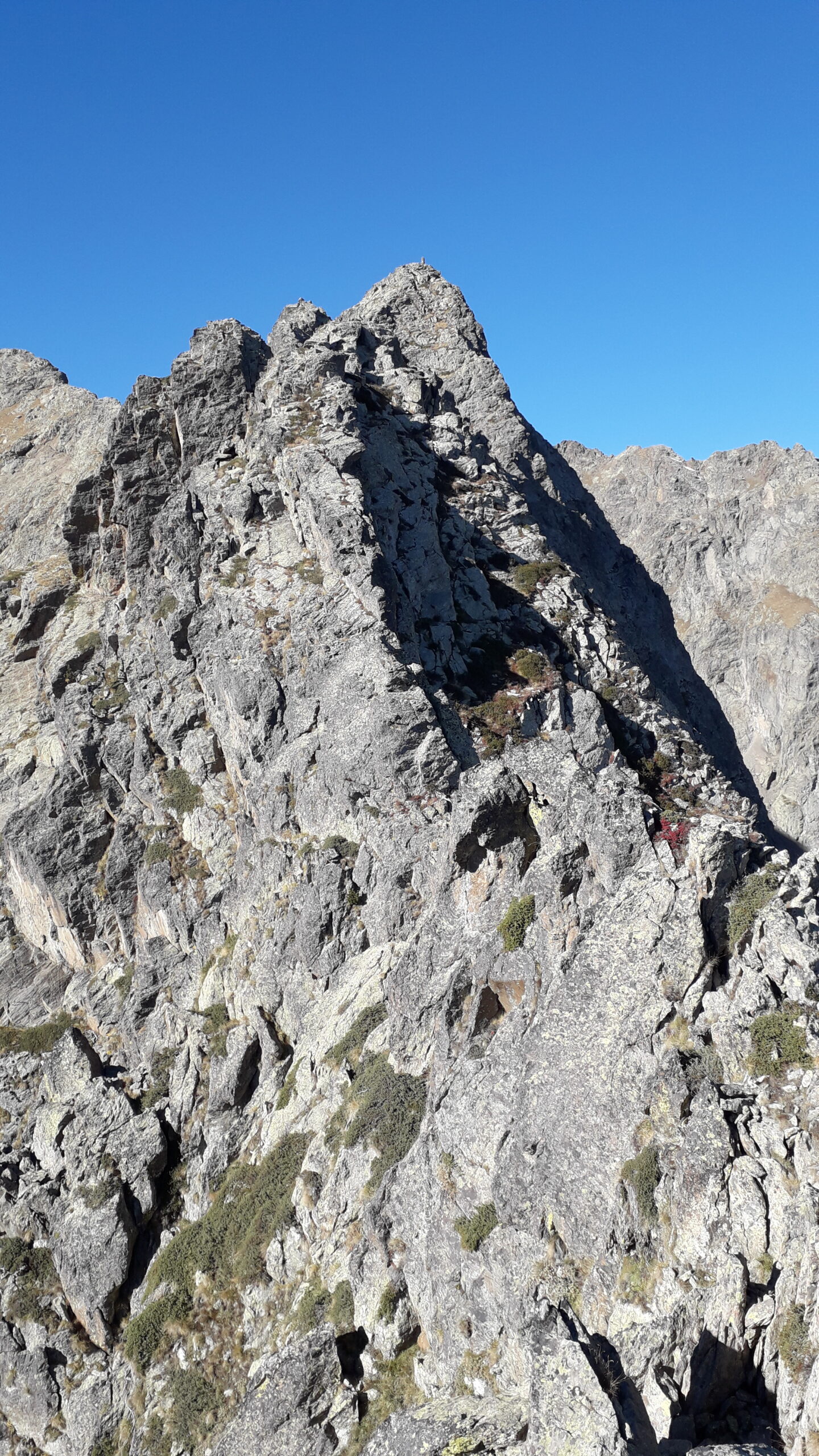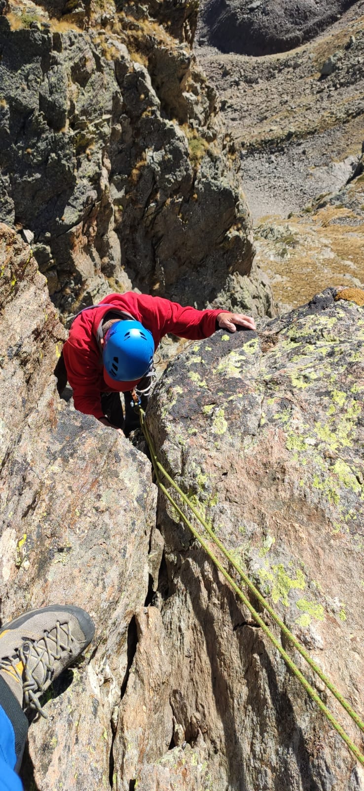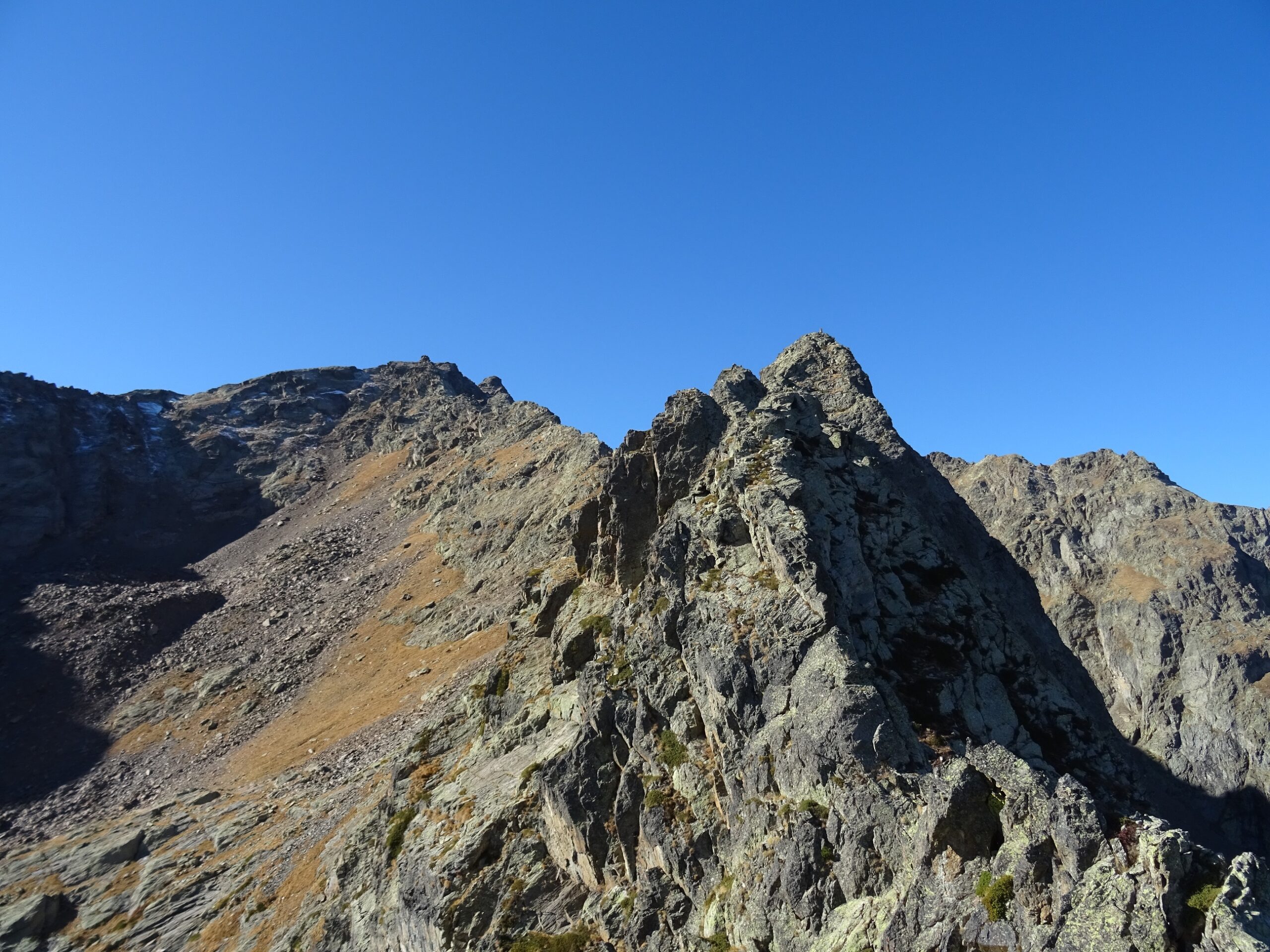 Segue un lungo tratto più affilato ma mai particolarmente esposto e il superamento di una serie di torrioni (II qualche passo di III, tratti di II+ in discesa). I più grandi si superano sul filo, i gendami più piccoli si aggirano lato nord. In cima all’ultimo torrione si trova una sosta a cordoni per una calata di 25 m fino alla forcella successiva (anello di corda per una sosta intermedia dopo 15m).