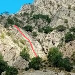 - L1 – partenza facile, poi tetto , leggero traverso a destra in placca e sosta 35 m 4 5+ 5 chiodatura lunghetta da integrare dove possibile con friends