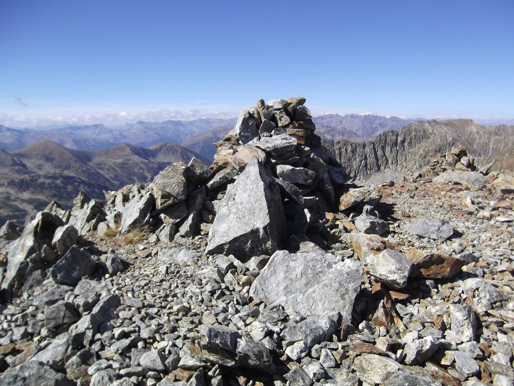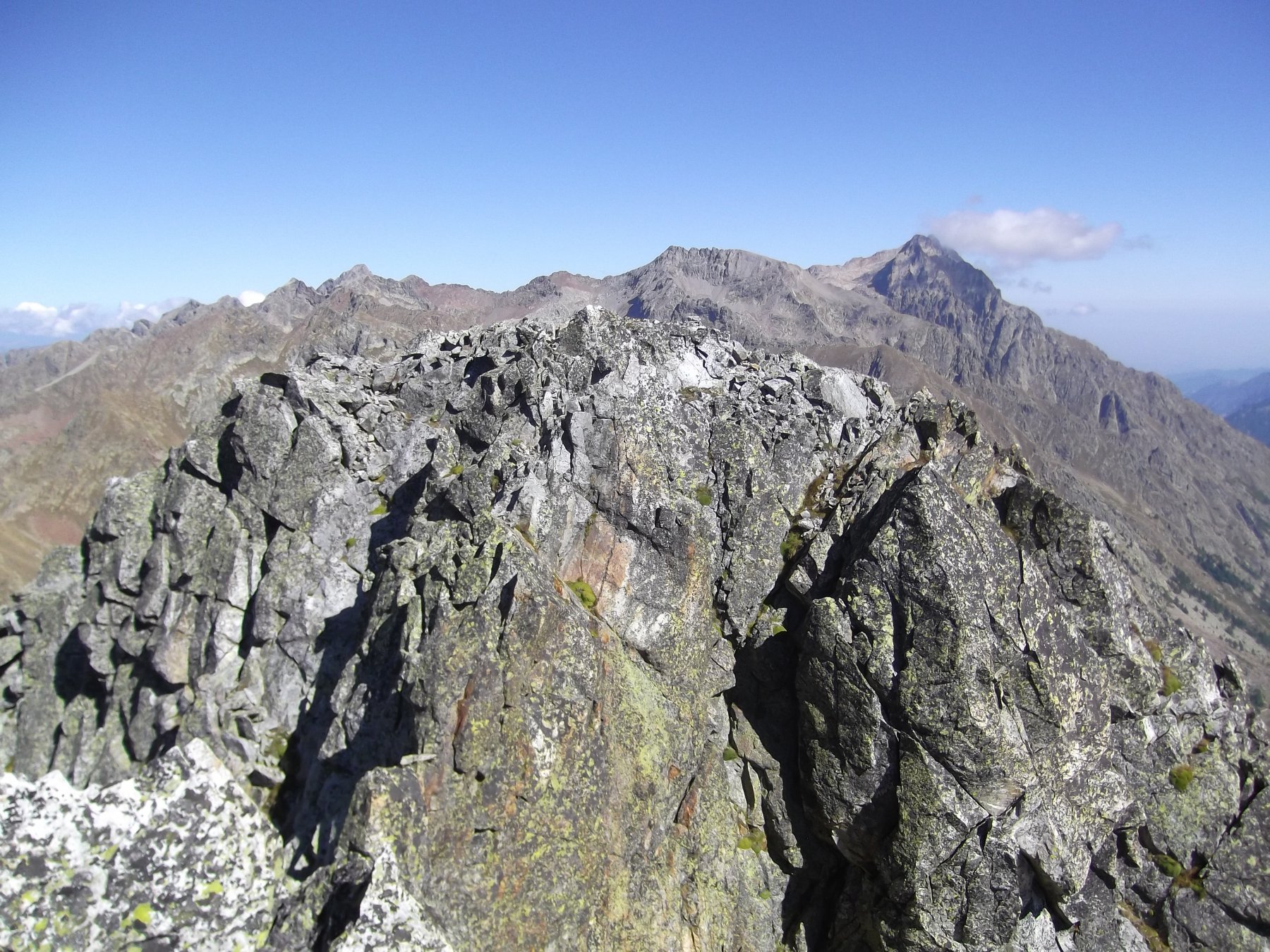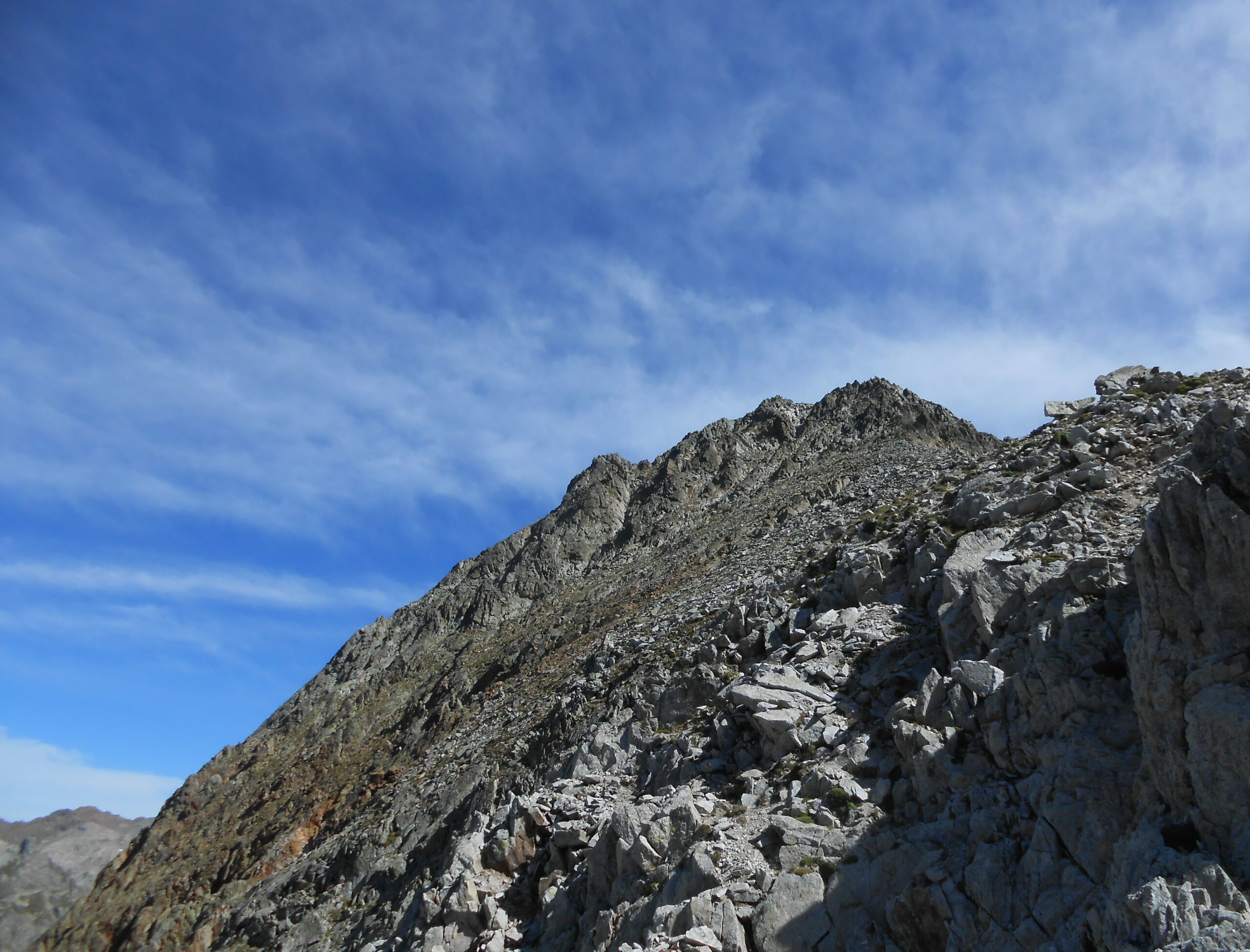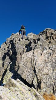 Quando termina la parte ampia di cresta, ci si sposta sul lato nord, seguendo sempre evidenti ometti, e con passaggini su facili roccette si perviene nella parte alta, alla base di un canalino biancastro.