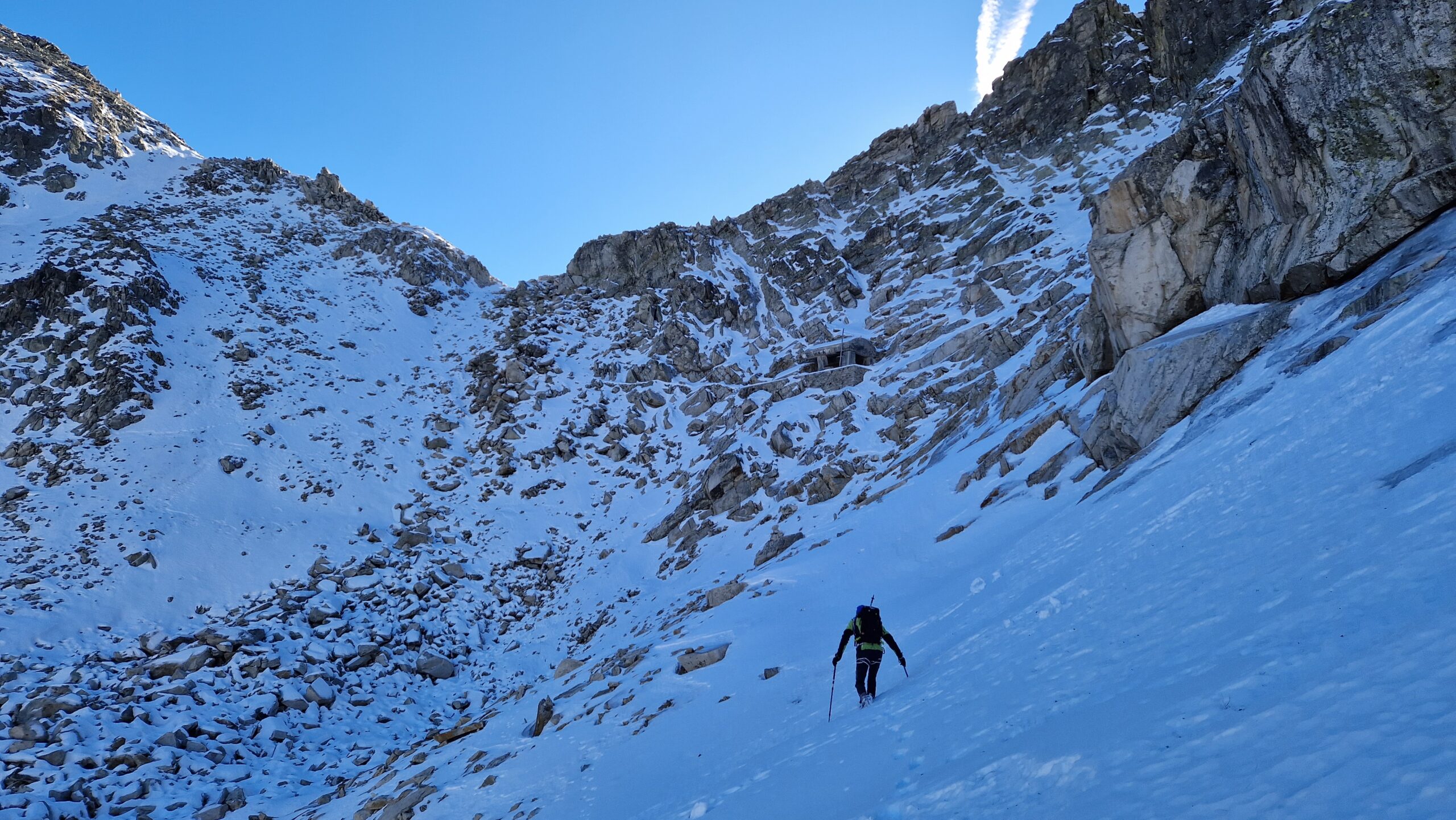 Per arrivare alla Bassa della Lausa ci sono delle tracce che proseguono a mezzacosta tra scomodi sfasciumi, tagliando alla base della casermetta, oppure si scende di poco nella grossa pietraia per poi ritrovare delle tracce piu’ comode che portano alla Bassa.