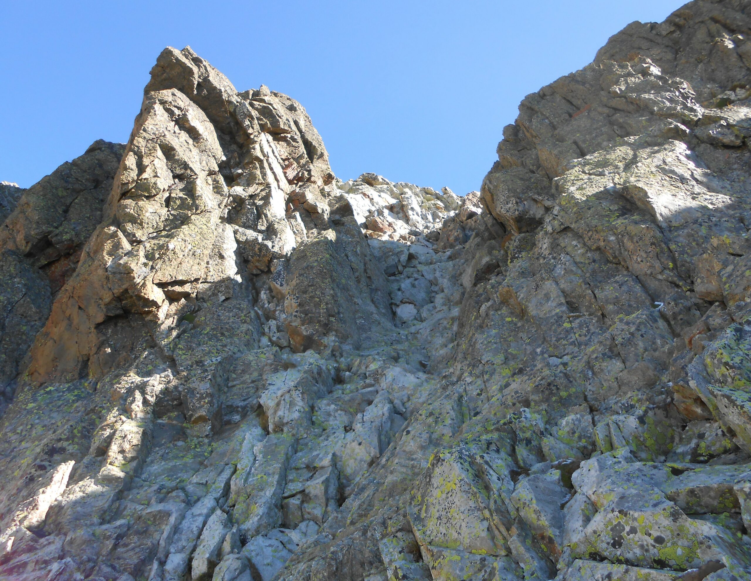 Lo si supera con passaggi di I e II° massimo, su ottima roccia, ma facendo attenzione perche’ a monte di questo ci sono sfasciumi accatastati.