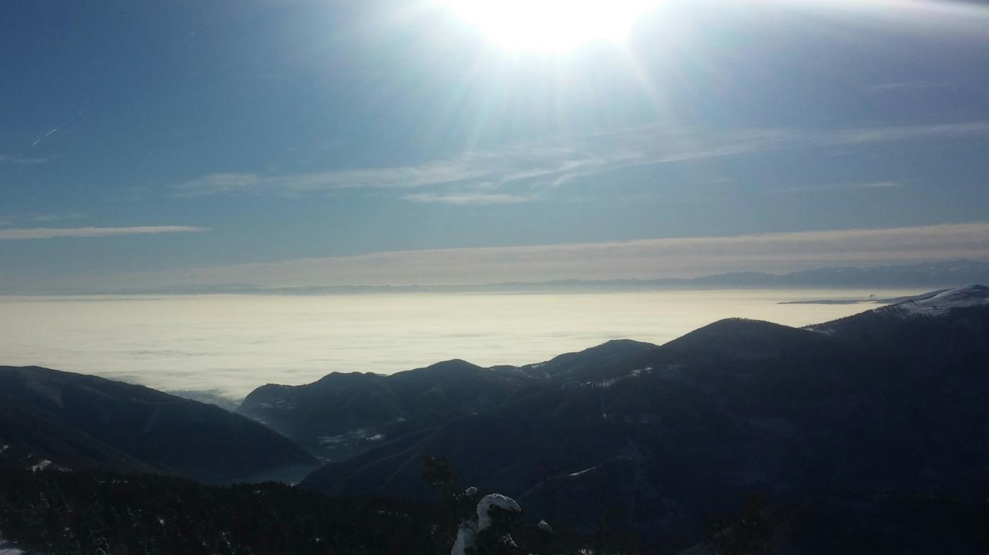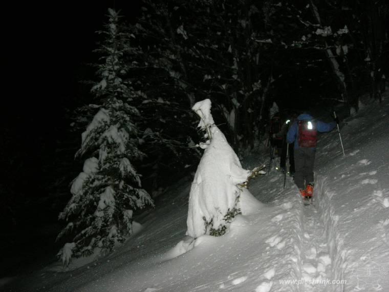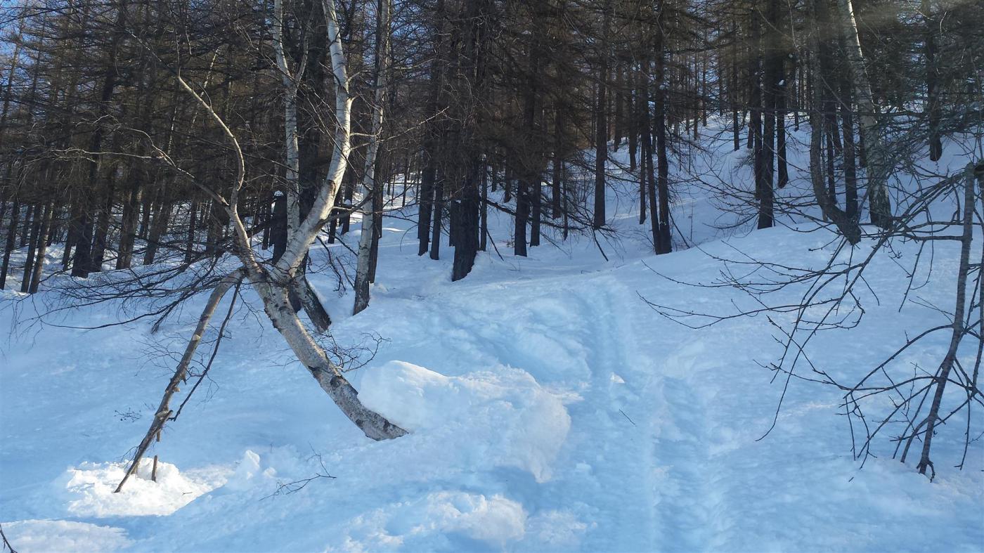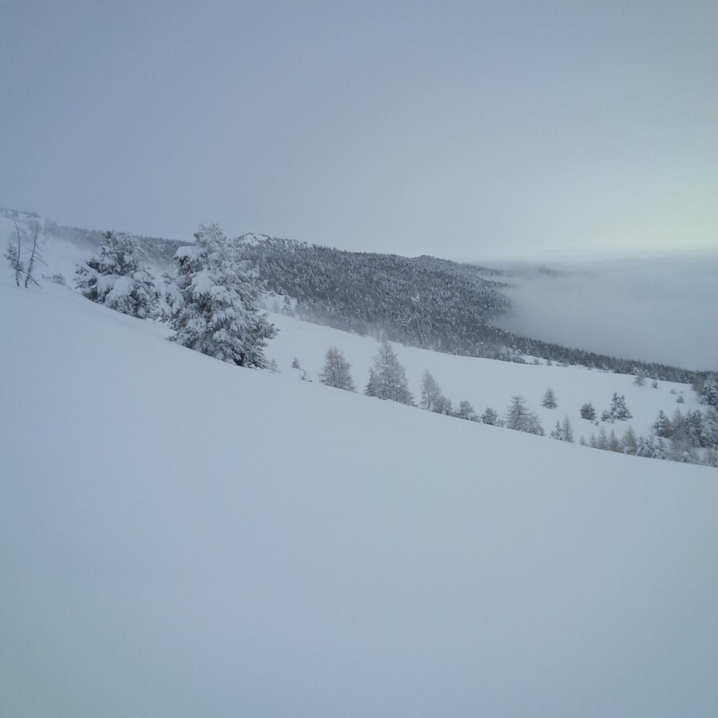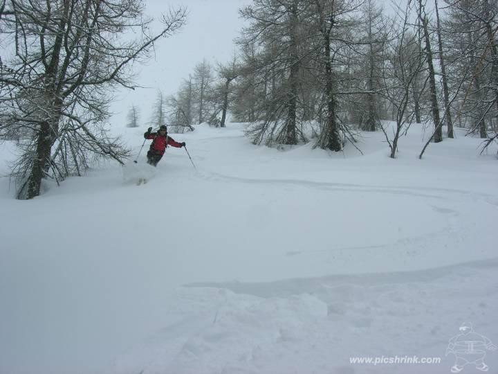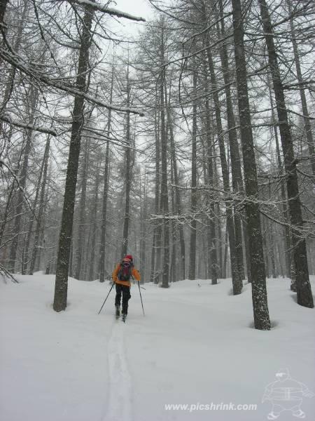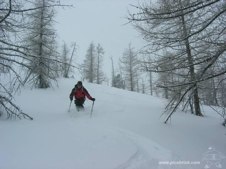 Discesa: si torna al colle, o meglio alla q. 1614, da quì direttamente (nordovest) su pendii dapprima sostenuti, poi di nuovo nella bellissima foresta (Bosco dell’Ala) su Fraccia Durant e poi i bei prati sopra Trussan