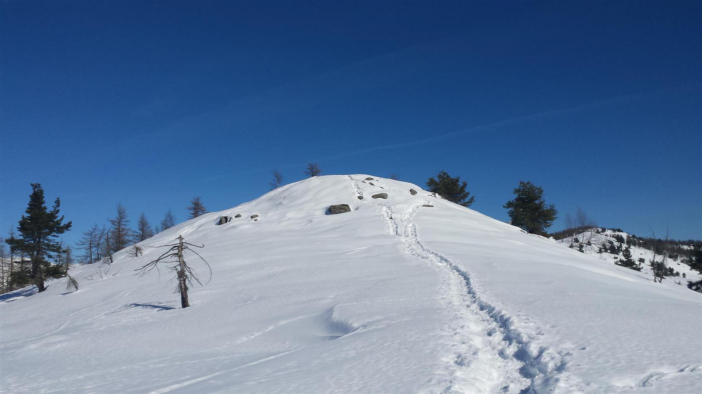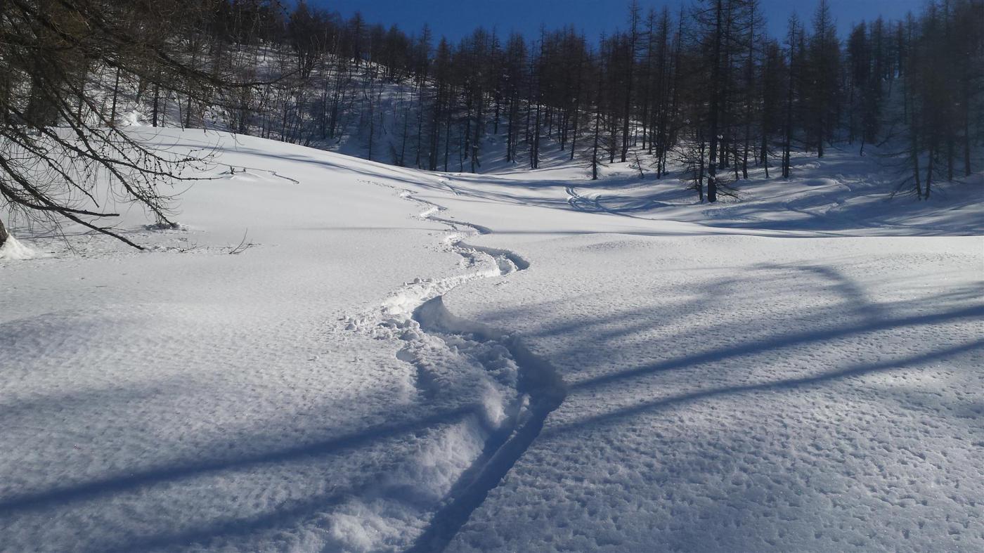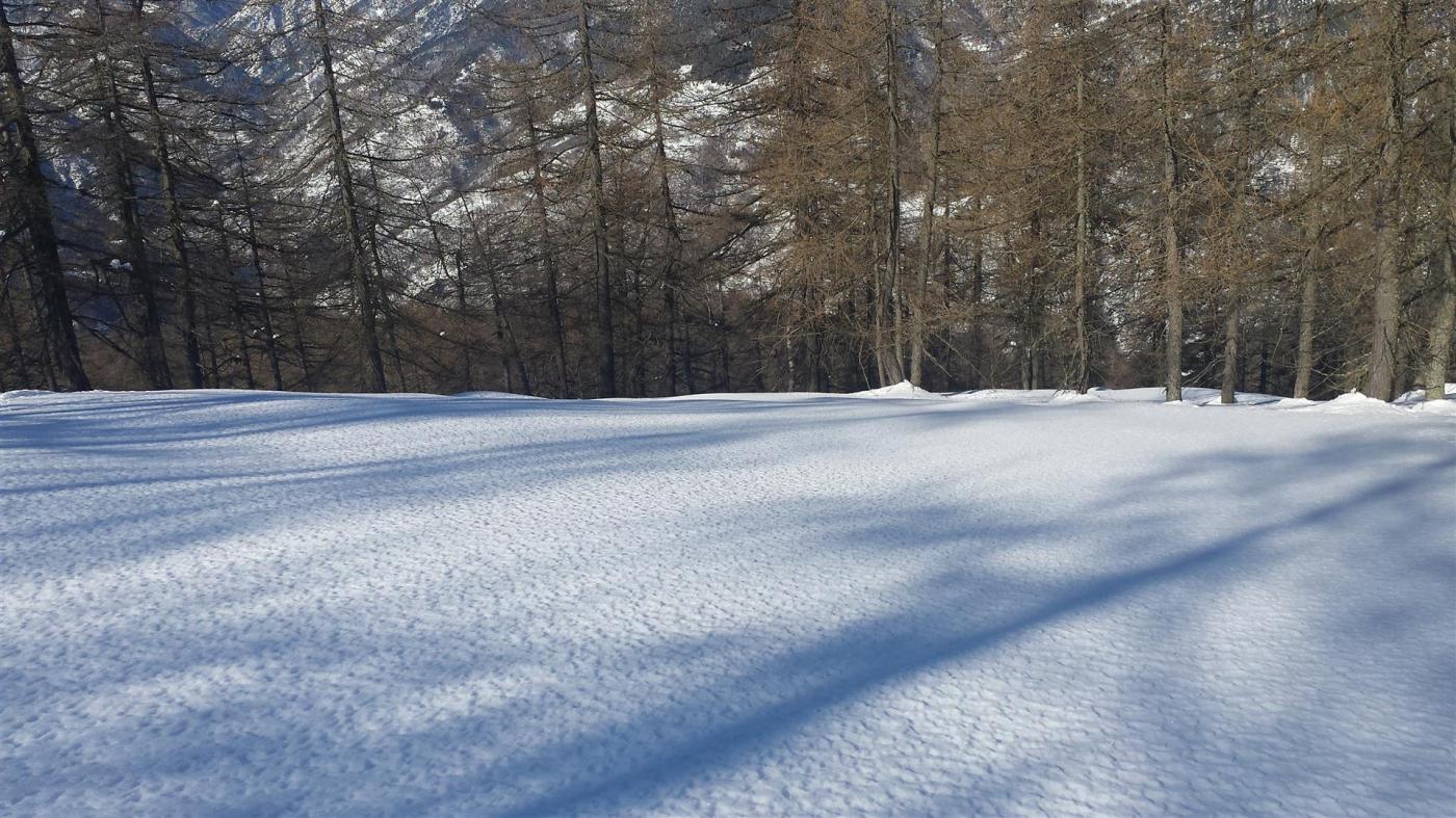Per la discesa non ho seguito la direzione di salita ma le indicazioni della relazione e, dopo un bel scendere nel lariceto con neve un pò pesante ma molto divertente, mi sono spostata troppo a nord ovest finendo in un bosco fittissimo (dove sono volata e per la troppa neve non riuscivo a rialzarmi) e sbucando alla destra di Comba Garino sulla strada che porta ad Albarea. I pratoni iniziano a crostare. Temperature alte 13° alle 14.