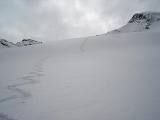 Innevamento continuo dopo l’attraversamento del torrente; 30/45 minuti di portage. Alla partenza tempo incerto con nuvole basse ma meteofrance prevede miglioramento; nella notte caduti 10/20 cm di neve, lavorati dal vento soprattutto nella parte bassa.