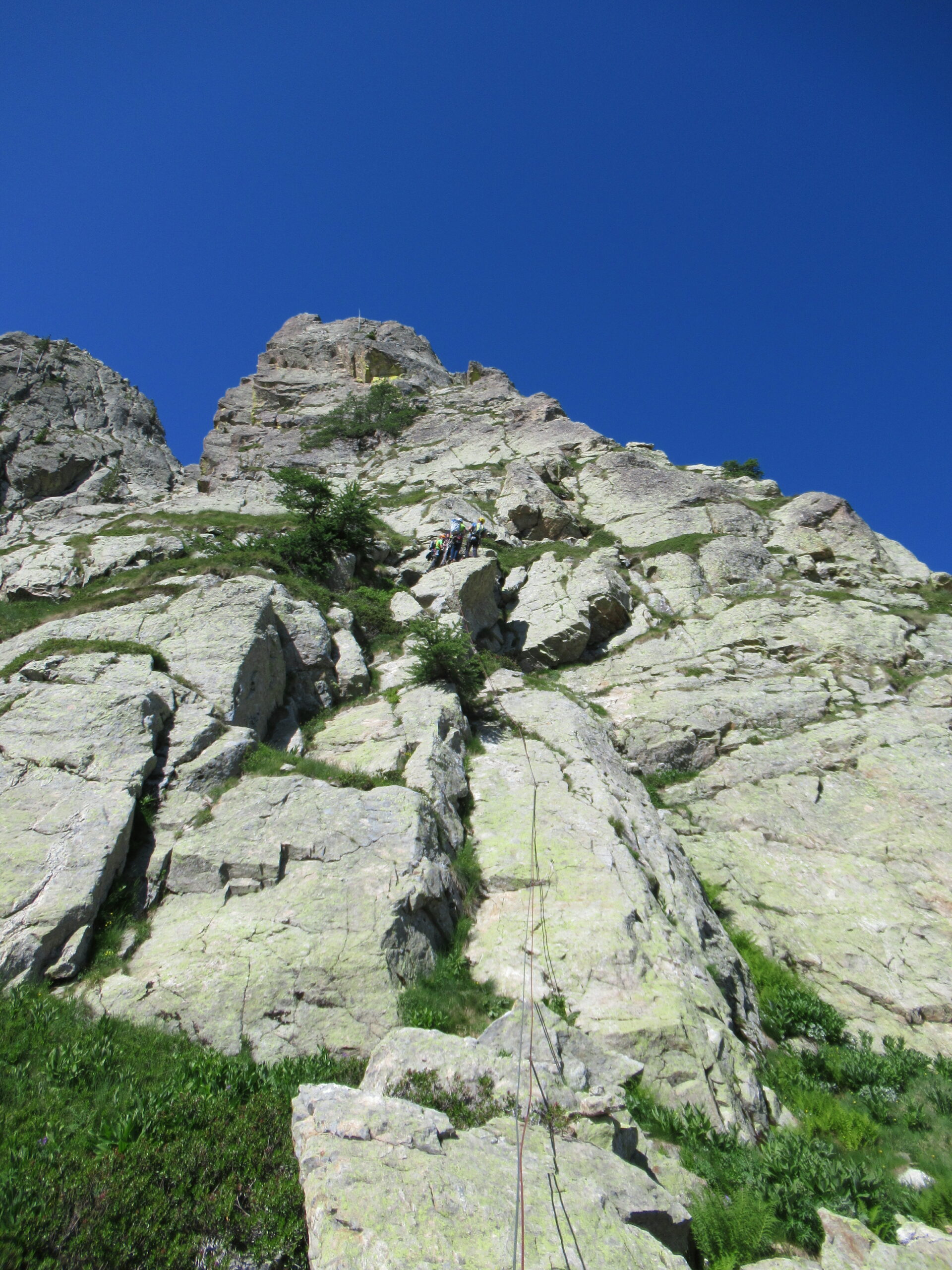 Possibilità di continuare sino al sentiero per il colle del Lausfer salendo l’ultimo tiro della via delle placche o discesa alla base della via contornando lo sperone su pietraia.