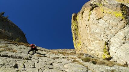 Sole a palla ma di ghiaccio. Cielo azzurro cobalto. Sembrerebbero gli elementi ideali per la buona riuscita di una gita, non fosse per il vento a farti percepire una temperatura ben al di sotto lo 0 di diversi gradi. Immaginarsi ora una salita per quanto facile e breve che possa essere, il doverla affrontare in simili condizioni. Che brutta sensazione il non sentire il tocco della mano sulla roccia, ne l’appoggio per i piedi, causa il gran freddo alimentato quest’ultimo, da un vento che non ha mai smesso di flagellarci e impedirci di rimanere sul filo, dove chiaramente si vedevano gli spit nella seconda parte, quando da placca la via si sposta in cresta a cavallo della quale come detto, impossibile resistere al vento quel minuto di piu’. Concluso la salita comunque, resistendo alle continue gelide folate da est, fino in cima alla Testa Colla Auta, parte camminando parte arrampicando. Forte il desiderio di scendere al piu’ presto alla ricerca di quell’equilibrio termico qui venuto a mancare alla grande nonostante il sole a palla tutto il tempo.