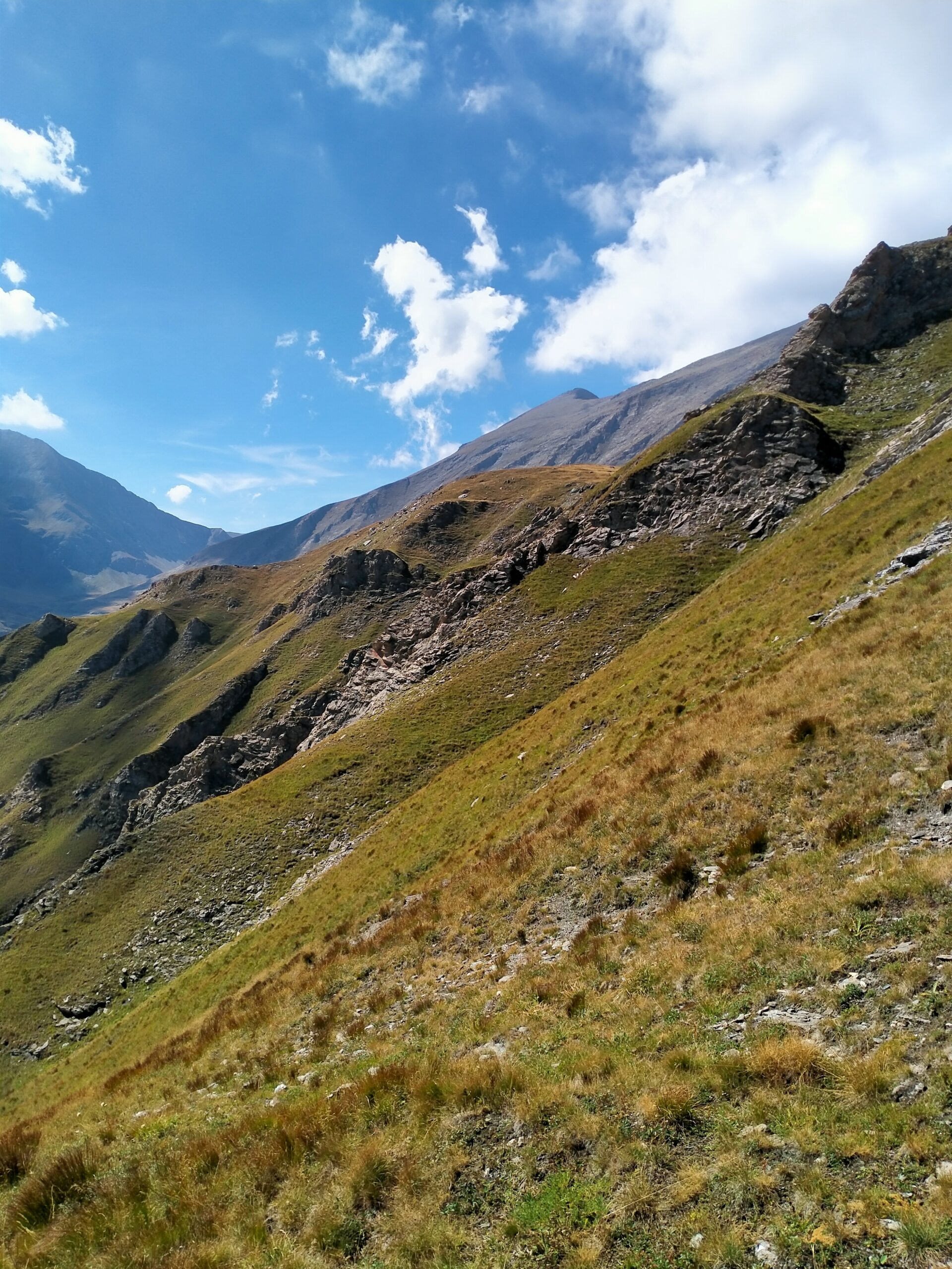 La traccia inizia a occidente dell’alpeggio e prende quota con alcune risvolte, quindi taglia a Ovest attraversando in vari canali del versante meridionale del Becco dell’Aquila, quindi, in falso piano o leggera discesa, del Truc Cialabrie, del Bric dei Denti fino a giungere in vista dell’alpe Lauson che si raggiunge superando un fastidioso macereto e perdendo un centinaio di metri di quota.