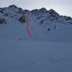 Raggiungere la base della parete come per l’ itinerario alpinistico e risalirla senza itinerario obbligato fino al colle, dove si lasciano gli sci. Dal colle aggirare a sinistra un primo saltino e proseguire per una cresta rocciosa di II grado, relativamente facile anche quando è innevata.