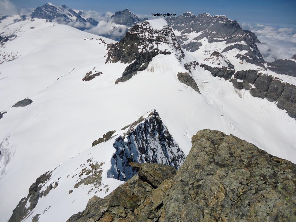 Secondo giorno: dal rifugio risalire il ghiacciaio fino al punto più alto raggiunto il giorno precedente (appena a destra della cresta di rocce poco rilevata in direzione sud-est). Da qui proseguire in direzione ovest costeggiando sul versante sud prima la cresta di rocce e poi, con un paio di saliscendi, le pendici dello Tschingelhorn fino a giungere sotto un colletto glaciale da cui parte la lunga cresta di roccia che porta in cima al Breithorn (Wetterlücke, 3181 m).