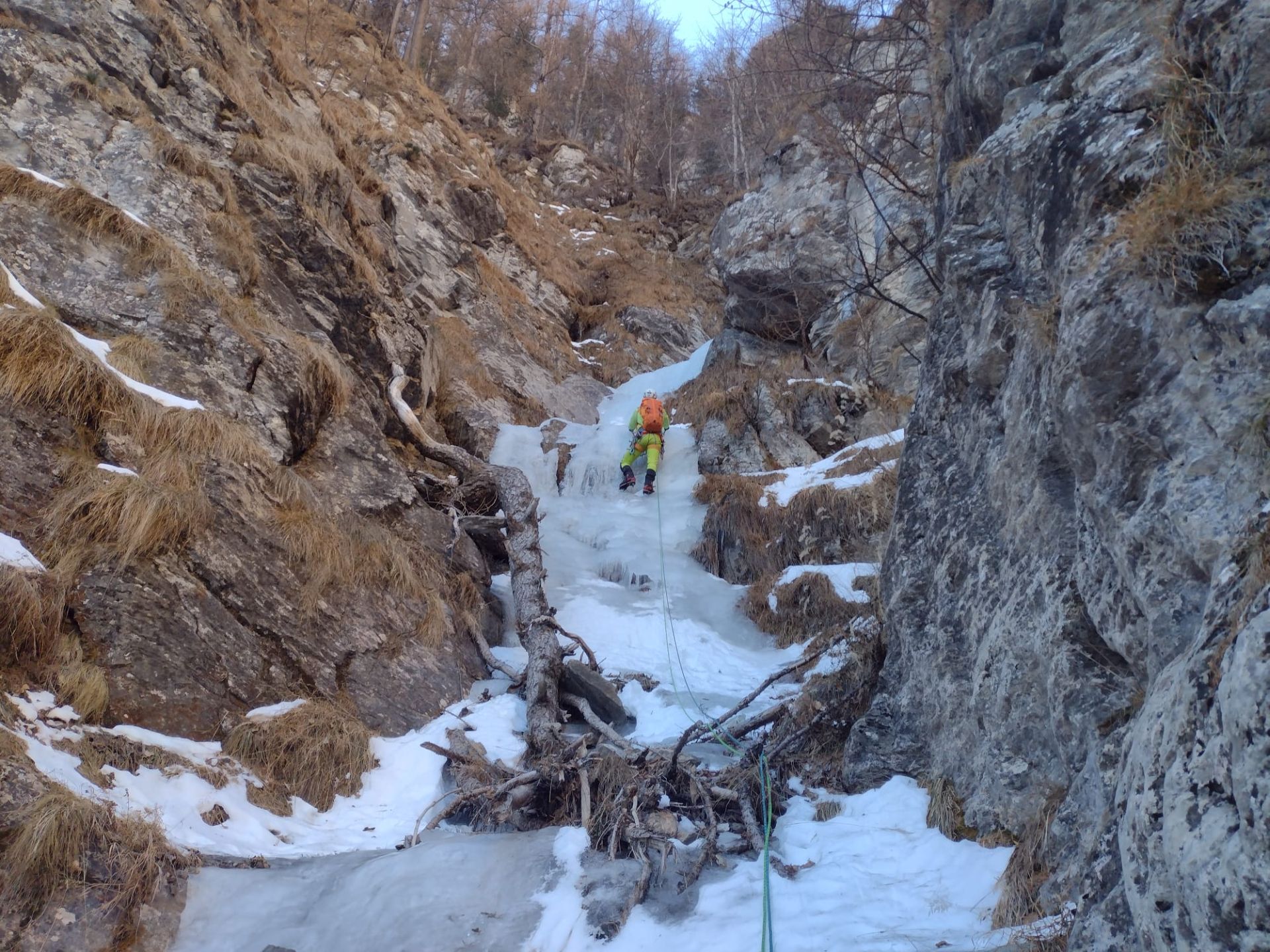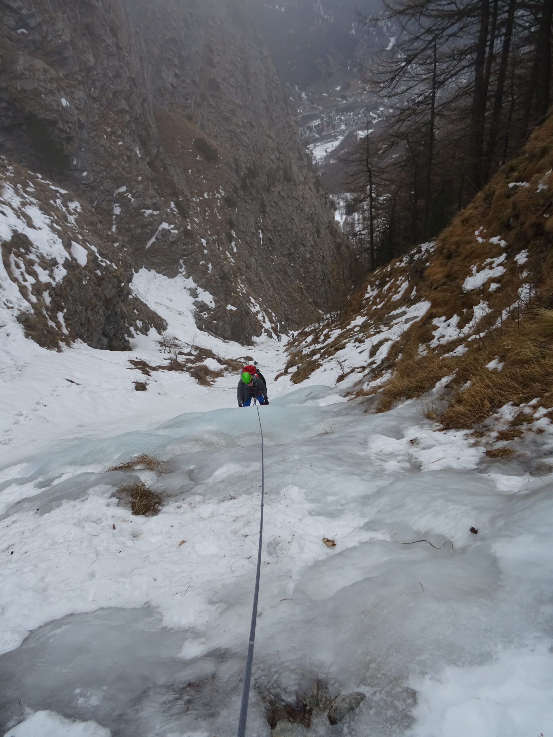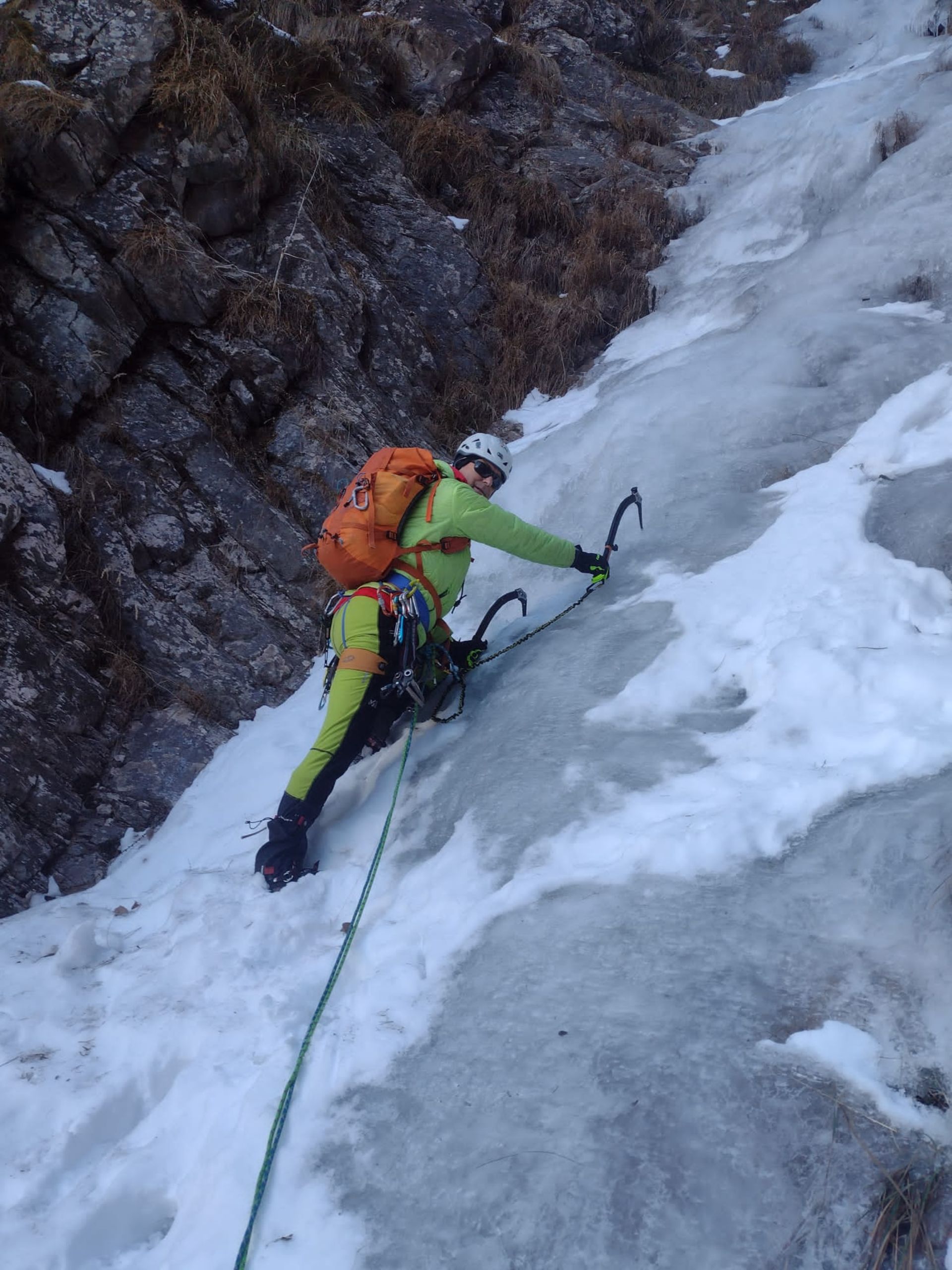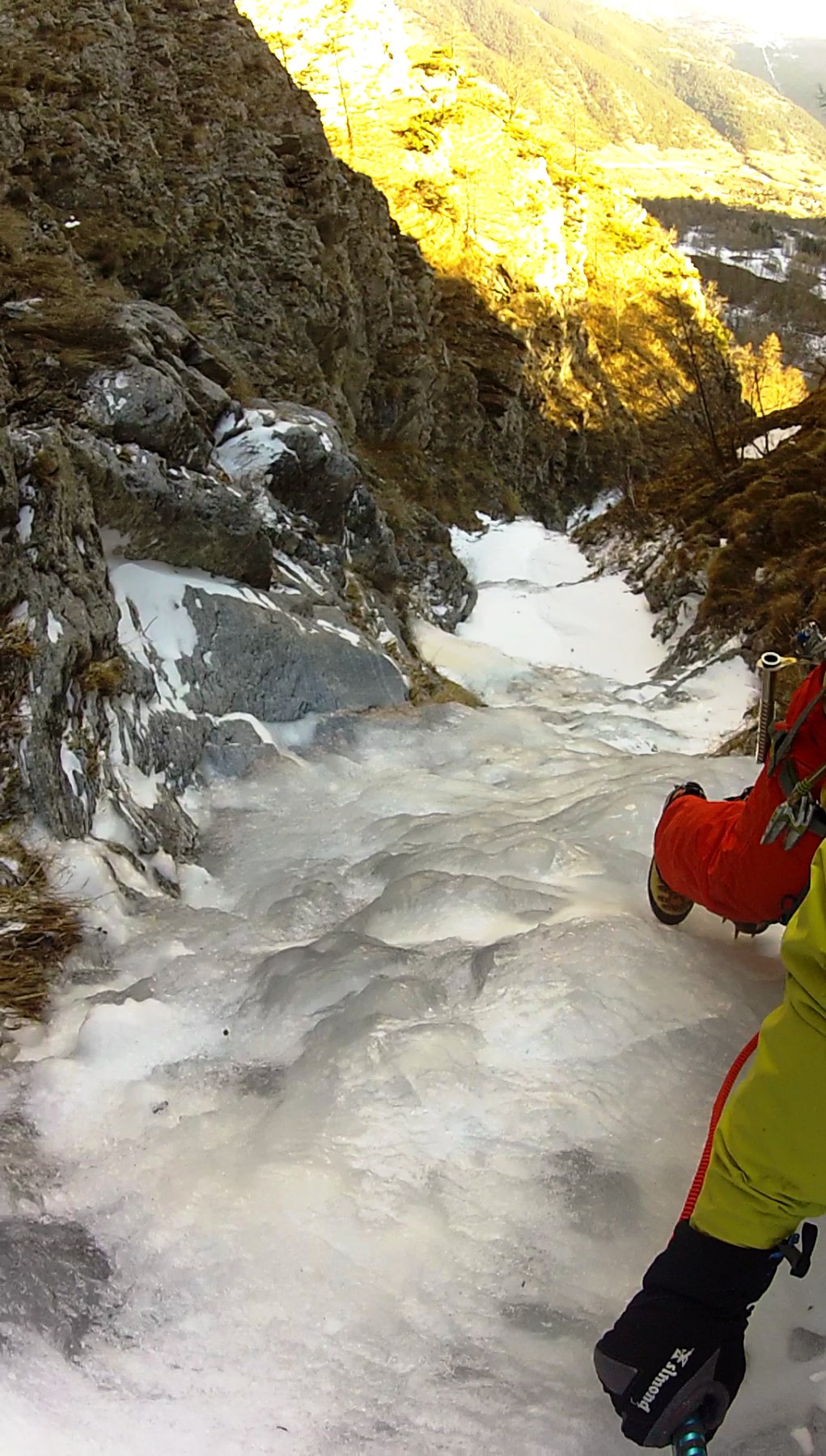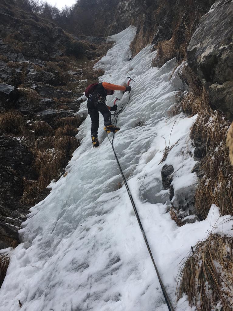 Risalire i primi 4 tiri su ghiaccio con pendenze tra i 60° e i 70°.