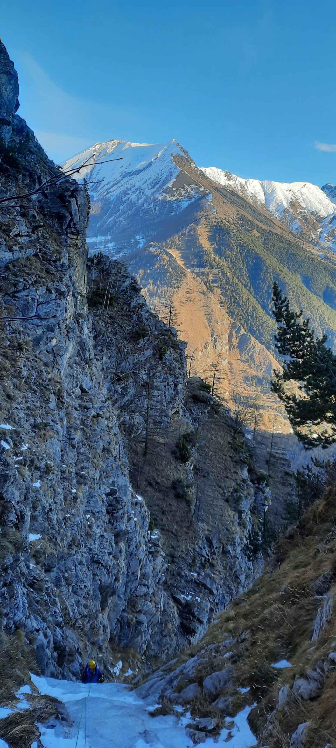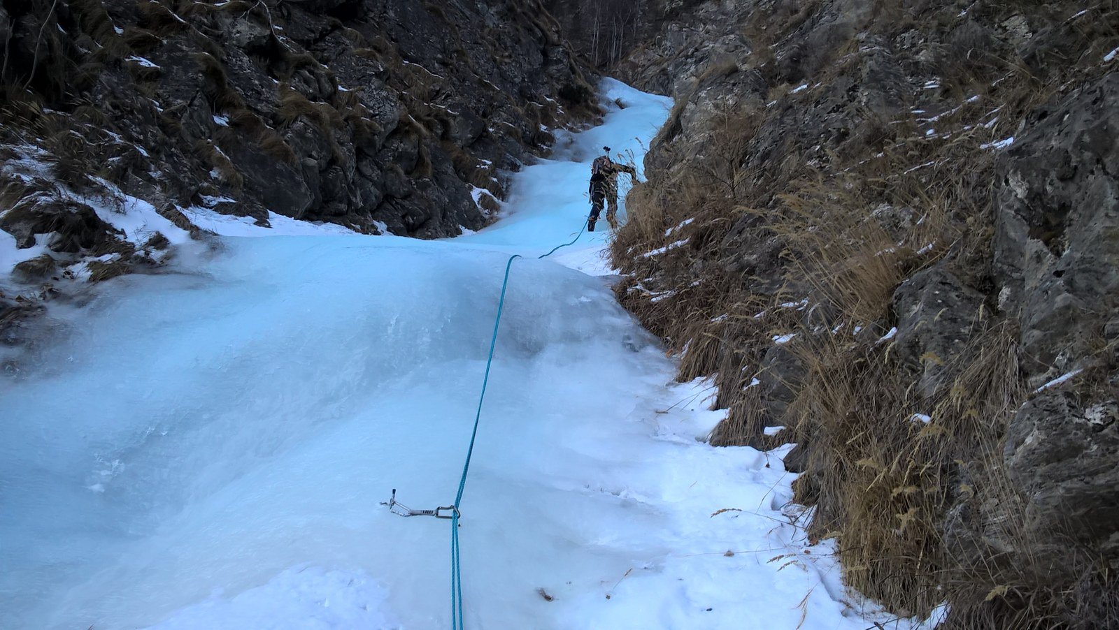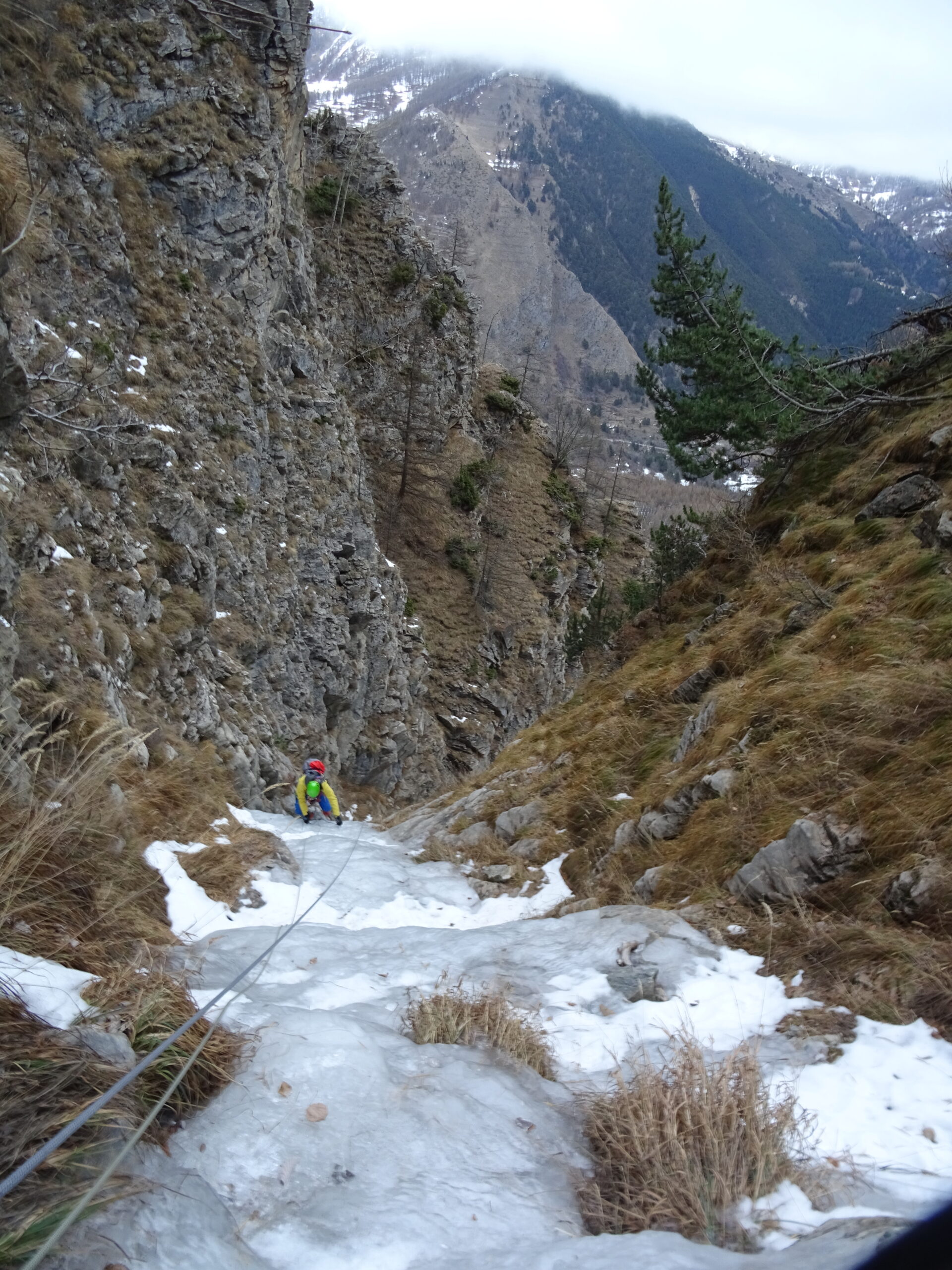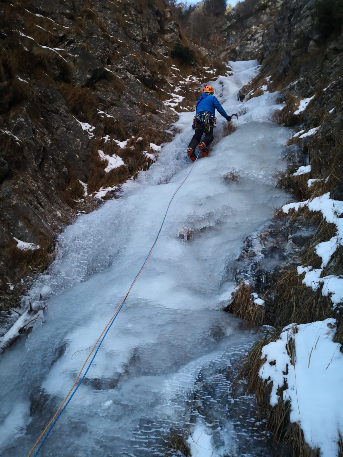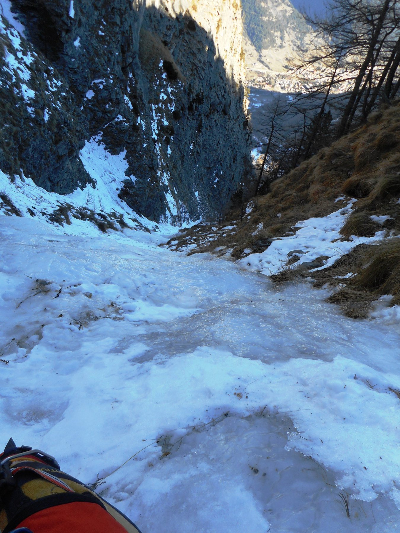 Risalire i primi 4 tiri su ghiaccio con pendenze tra i 60° e i 70°.