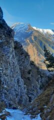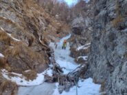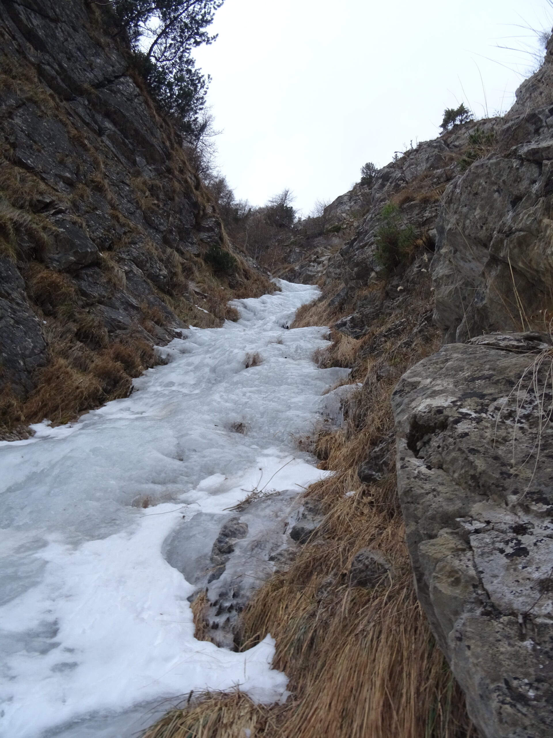 Proseguire fino al secondo tornante a q.1455 (panchina) e da lì abbandonare la strada, voltare a destra e scendere nel rio, per risalire il canale che sale verso la bastionata rocciosa, fino al primo evidente risalto di ghiaccio (~15-20min).