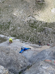 Discesa: Da S11 si traversa 20m a una sosta a destra, da qui una serie di calate (3/4) riportano su cengia di L4. Si percorre la ferrata a ritroso e si fa una doppia da 60m giusti fino alla cengia d’attacco.