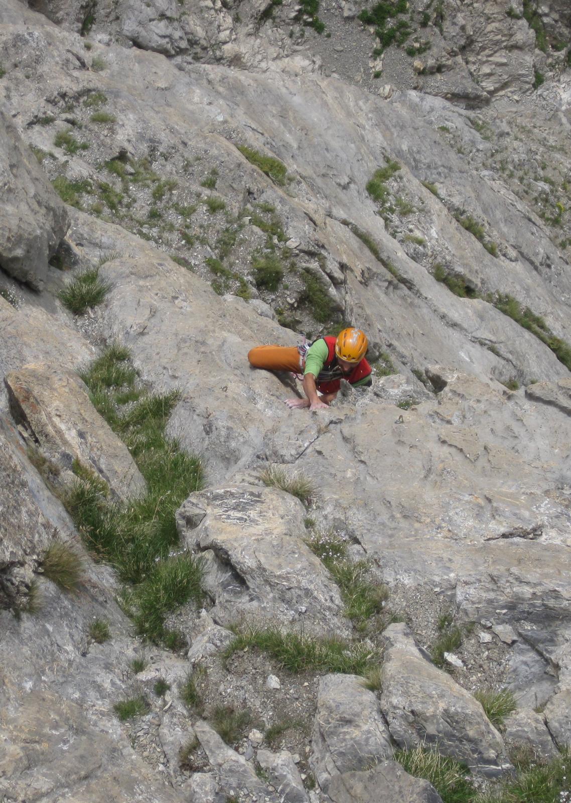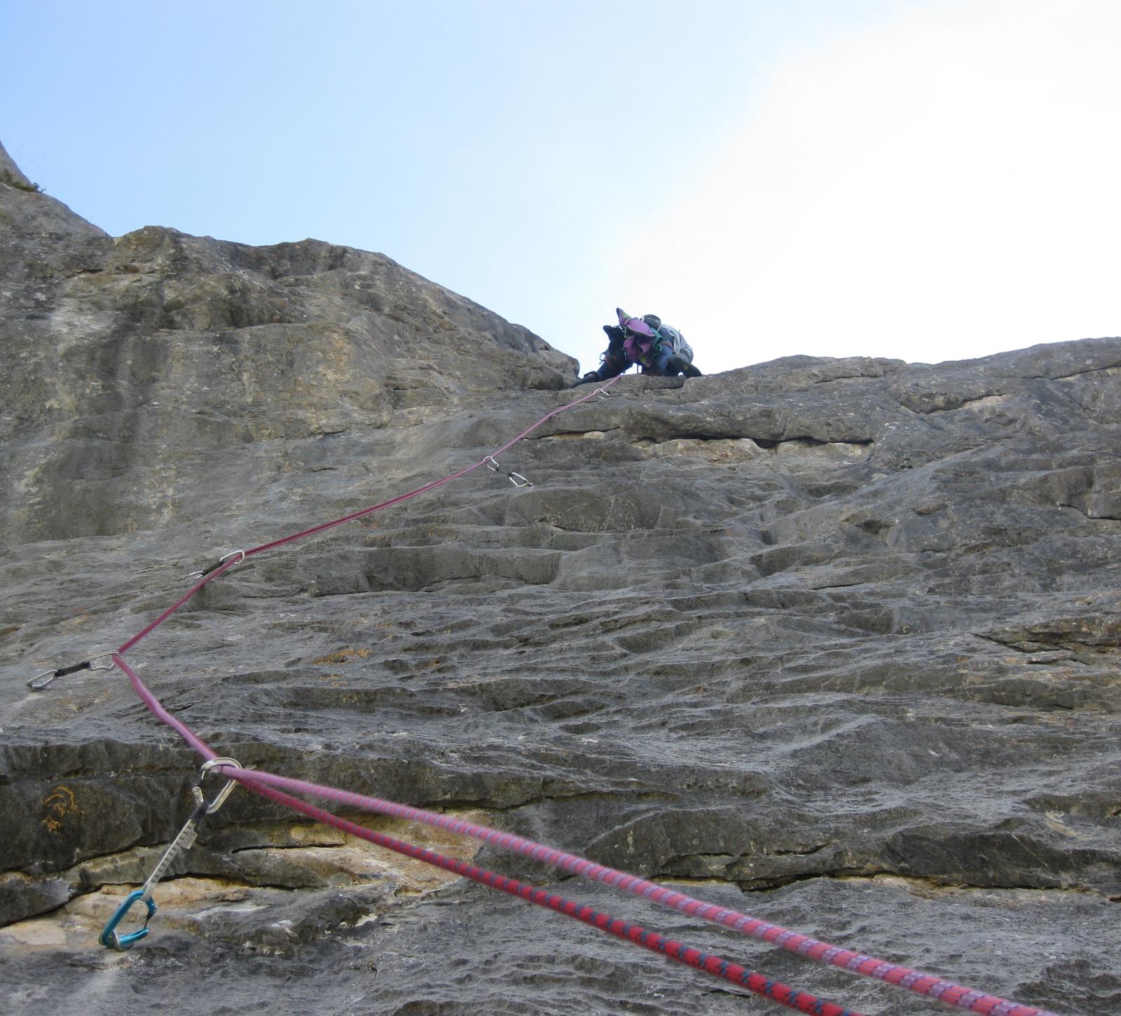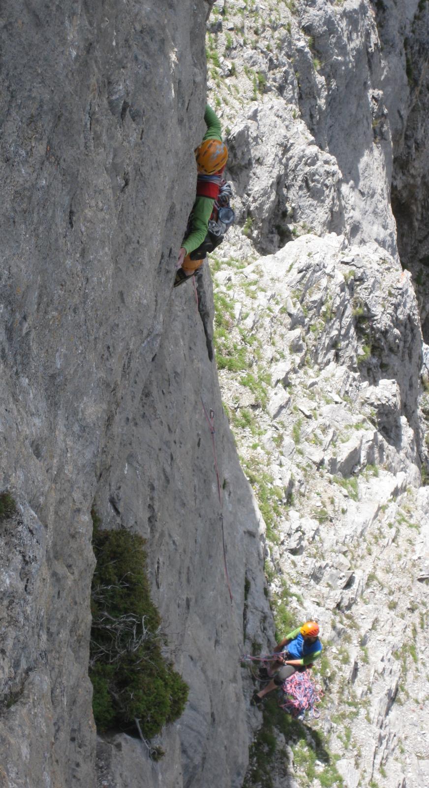 6° tiro: 6a+, tiro breve ma molto bello su muro che in breve, dopo un secondo risalto, porta in sosta su cengia.