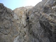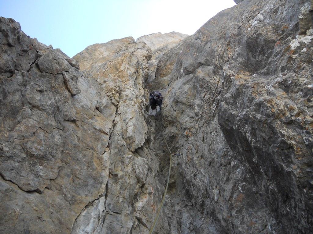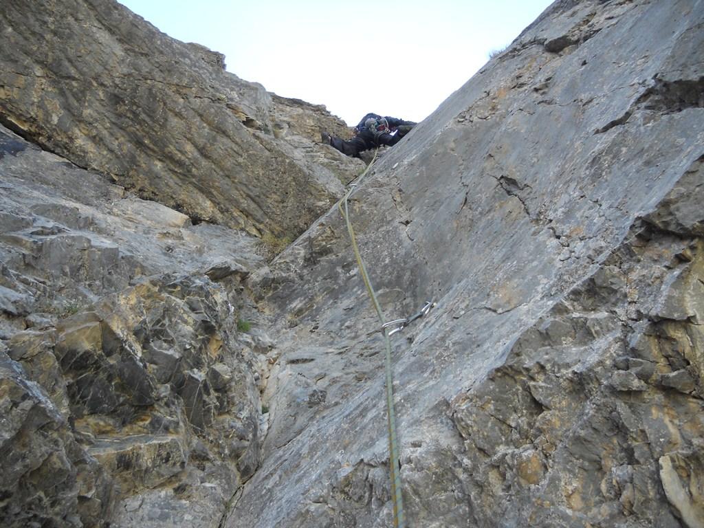 Fare comunque molta attenzione perchè non è molto evidente, infatti noi abbiamo sbagliato e abbiamo proseguito per altri due tiri sulla via sbagliata, per poi fare un vertiginoso traverso e raggiungere finalmente la via Davin.