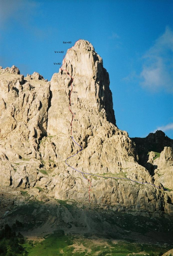 per arrivare faticosamente all’attacco(lo sconsiglio); oppure come noi, si risale il pendio erboso e a tratti pieno di sfasciumi , in direzione della via “l’etoile et var de dèpart”, si attacca la via e si fanno i primi due tiri, successivamente si traversa a sinistra e si raggiunge l’attacco.