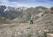 Lasciata l’auto al tornante salire per prati anche ripidi ma in stagione punteggiati da fiori e ancora fiori, imboccare un vallone a sin. salendo in direzione SO e con percorso libero abbiamo raggiunto la q. 2486 m. esattamente sotto il versante ESE della cima. (Si può evitare questa digressione e puntare direttamente alla q. 2458 m.) A questo punto capiamo di aver sbagliato e quindi lasciamo l’idea della traversata. Con percorso libero tra ammassi di frane e valanghe e prati, ritorniamo sui nostri passi e con saliscendi, dirigersi in direzione NNE fino a q. 2458 m. dove si scende per raggiungere il sentiero che sale al Colle di Valouise, prima di arrivare ad affacciarsi sulla valle, prendere una traccia che sale prima per prati e poi per sfasciumi fino al colle tra le due cime e quindi si arriva agevolmente alla Cima Sud a 2928 m. Discesa seguire la traccia e il sentiero al contrario fino al lago a q. 2350 m. e quindi per prati e vallette, puntare alla auto parcheggiata a Sud.