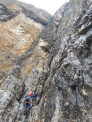 Roccia solida, sicuram.te ripulita dai passaggi, chiodatura sulla via piu che sufficiente in quantità, un pò meno in qualità,buona parte dei chiodi non sembrano molto affidabili, un chiodo di sosta nella nicchia prima del traverso finale è venuto via quasi senza carico, si riesce ad aggiungere friend piccoli o nuts per rinforzarla.Sui tiri si riesce ad integrare con friend e nuts. soste sempre da controllare. Alcune hanno degli ammassi di cordini inutili. Abb portato una serie di friend fino al 3 e qualche micro, si usano, mentre i nuts li avevamo ma non li abbiamo mai usati. Trovati fradici i tiri alti, ma d’altronde la sera prima ha piovuto fino alle 21. usata la relazione della guida dolomiti orientali vol. 2 di IV grado, ottima. discesa non cosi evidente, la suddetta relazione spiega comunque abb bene anche quella.