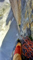 Una via epica: Le Tre Cime; una parete, la Nord della Grande, impressionate; Un visionario come Comici, che insieme ai fratelli Dimai, apre questa via in tre giorni nel 1933 passando in mezzo “ai gialli”. Scusate la pomposità dell’incipit, ma in questo caso ci sta. Abbiamo colto una finestra di bel tempo e siamo partiti per chiudere un progetto di cui si parlava da un po’. I tiri sui gialli sono ben chiodati, non ci si può perdere, ci si diverte a scalarli (qualcuno anche riuscito in libera) e scorrono veloci, li senti magari più tardi… usciti dagli strapiombi la via mantiene una logicità impeccabile, basta puntare alla base del diedrone giallo e nero e poi seguirlo per tre tiri; bisogna solo fare attenzione al punto in cui si abbandona il diedro per cominciare l’esposto traverso (io l’ho fatto un po’ troppo presto e mi è toccato uno slego di 15m su placca difficilmente proteggibile e non banale): FORSE dopo aver superato a dx il tetto marcato conviene proseguire su per il camino ancora qualche metro prima di traversare, ma valutate voi in loco. Traverso molto esposto e delicato, ma non pericoloso, usando il cervello si fa bene. Poi si tira su per facile terreno e si arriva alla cengia d’uscita. I chiave della difficoltà sono in basso, ma, sul piano dell’ingaggio, i tiri chiave sono stati quelli del diedro: fradici a dire poco, e lo rimarranno ancora per un po’ visto il tempo di queste settimane, bisogna usare bene la tecnica in diedro, con gli appoggi si riesce a salire senza troppi patemi, tirare di braccia sarebbe controproducente perché con le mani si tiene davvero poco.