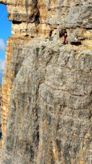 Materiale: 14 rinvii per i tiri bassi dove servono poco i friends, che sono indispensabili per la parte alta (anche per rafforzare qualche sosta scabrosa), oltre a una serie completa dal 0.3 al 4 abbiamo messo anche qualche nut. Ci abbiamo messo 12h ad uscire, senza code ma senza nemmeno nessuno da seguire, per i nostri standard non male, considerare anche 2h per la discesa. Sulla Comici solo noi 4 e una cordata dietro che probabilmente si è ritirata, qualche cordata in più sulla Dibona, ma veramente poca gente in giro per essere sulle Tre Cime… che goduria!