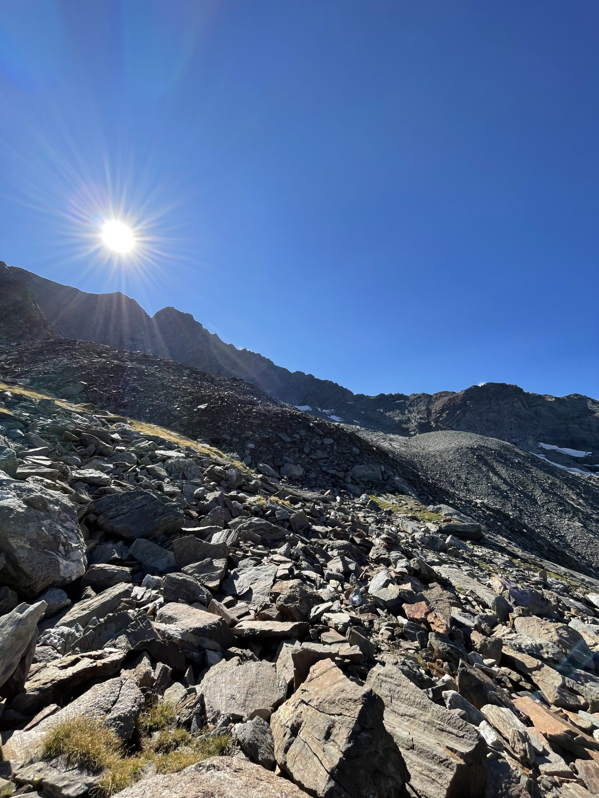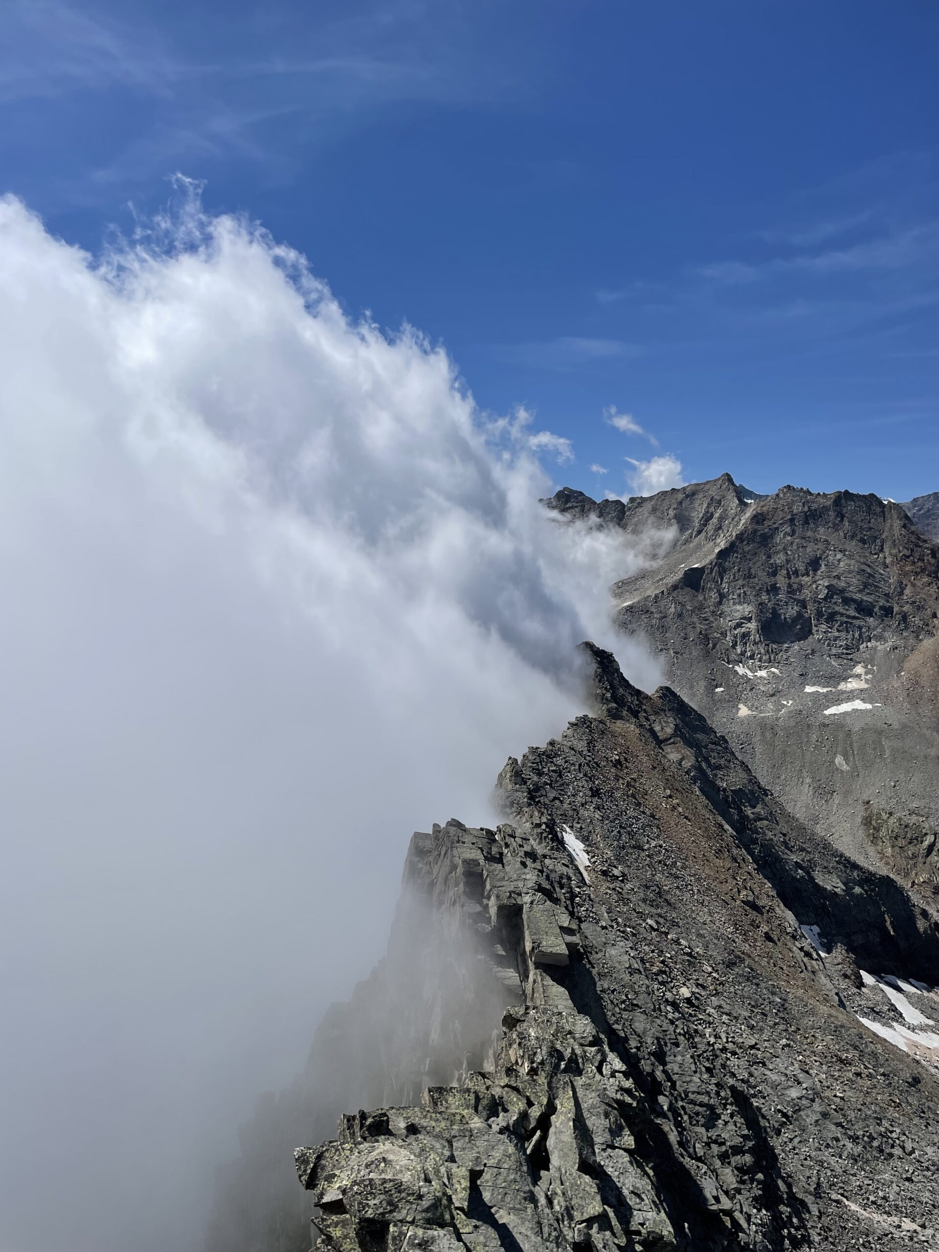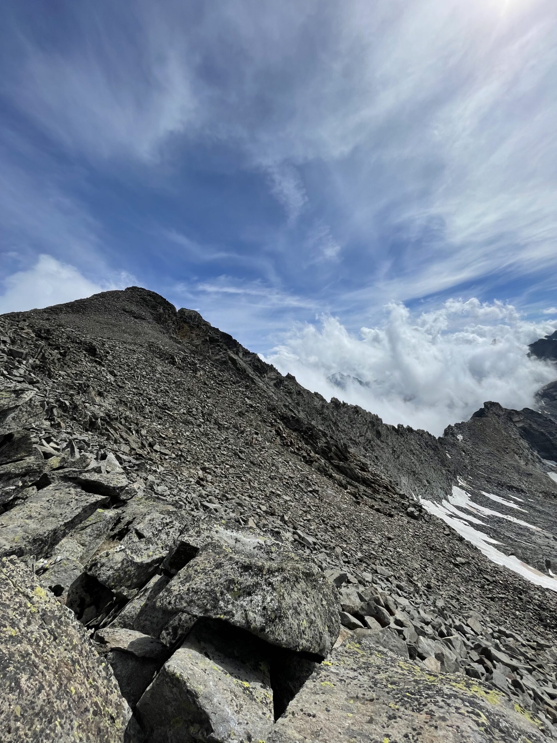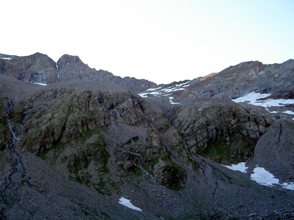 Discesa: scendere la cresta Nord (PD), cercando i passaggi più facili. L’ultimo risalto a monte del colletto tra le due cime può essere disceso direttamente (II+) o con una breve doppia. Si risale facilmente e su bella roccia fino alla cima Nord (3275m) e quindi si prosegue verso Nord fino ad una vasta pietraia (nevai ad inizio stagione), da cui si gira a sx per imboccare la cresta Ovest di discesa. Seguire la cresta, in alto facile e sassosa (radi bolli rossi e ometti), in basso invece più rocciosa e con alcune disarrampicate da ricercare, fino a raggiungere il bivacco.