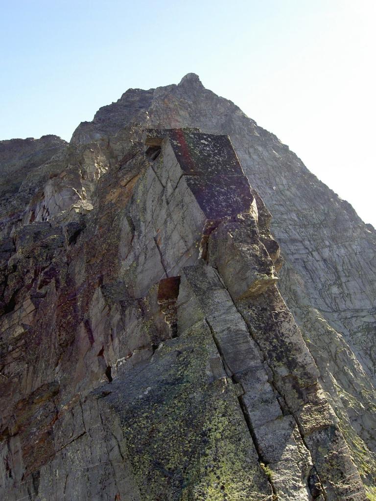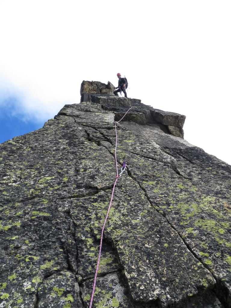 La cresta continua quindi più monotona e meno definita, con una successione di paretine di roccia più delicata e sfatta, da affrontare sul lato sx. Un ultimo breve camino di roccia delicata (III) permette di uscire alla base del castelletto sommitale, da vincere frontalmente (più difficile) o a sx della croce.