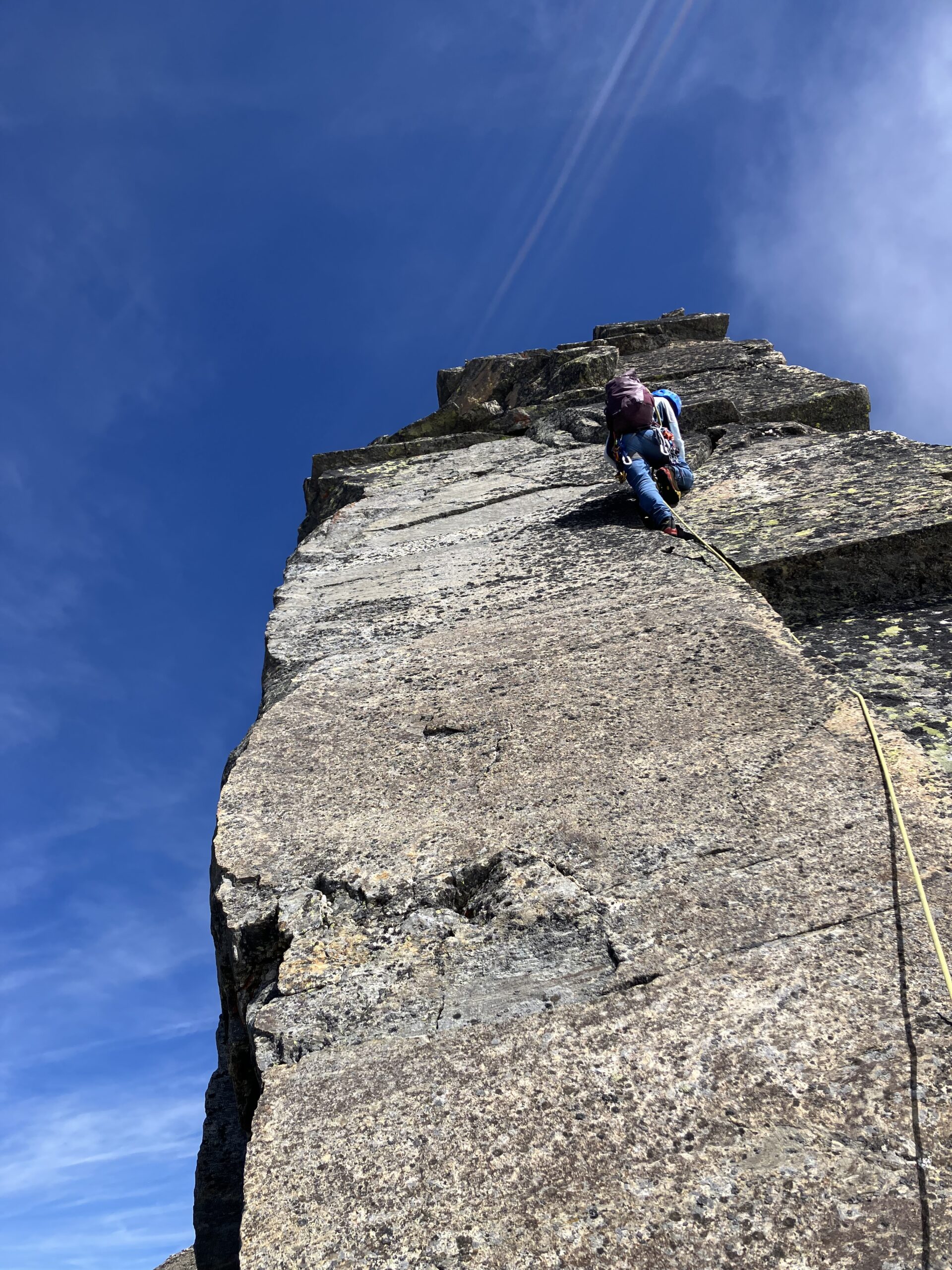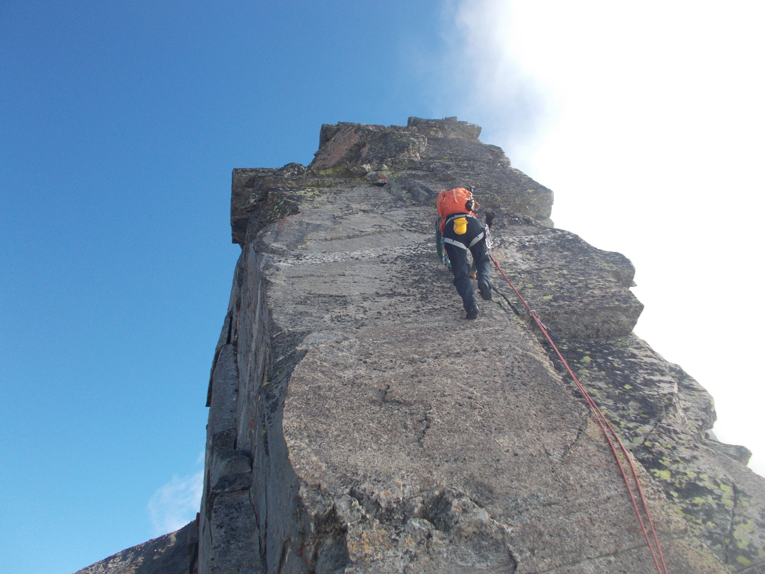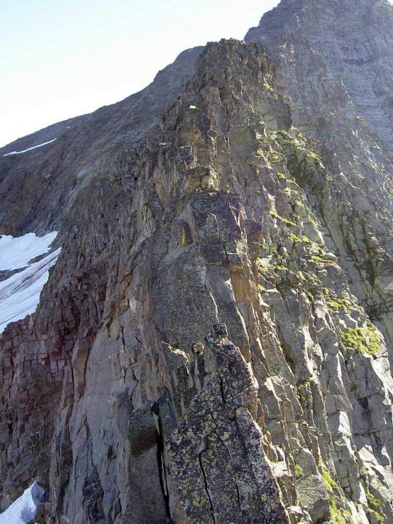 Si inizia con un primo tratto di cresta sottile ed esposta, senza grosse difficoltà (III/+) ma sicuramente scenografica.