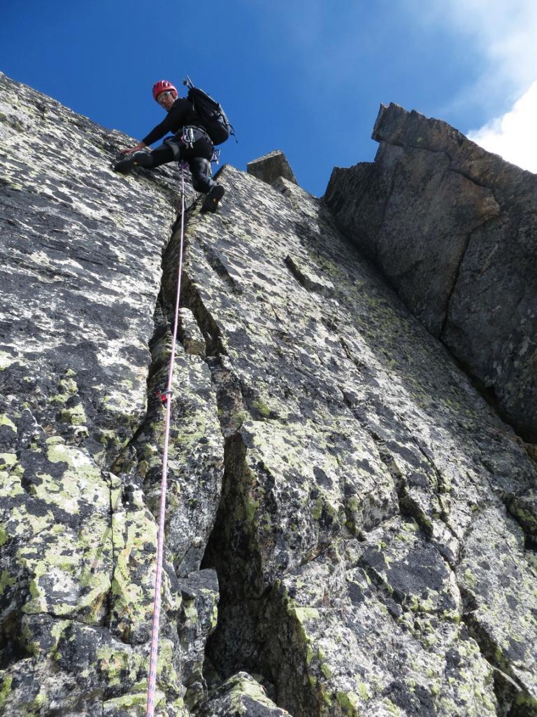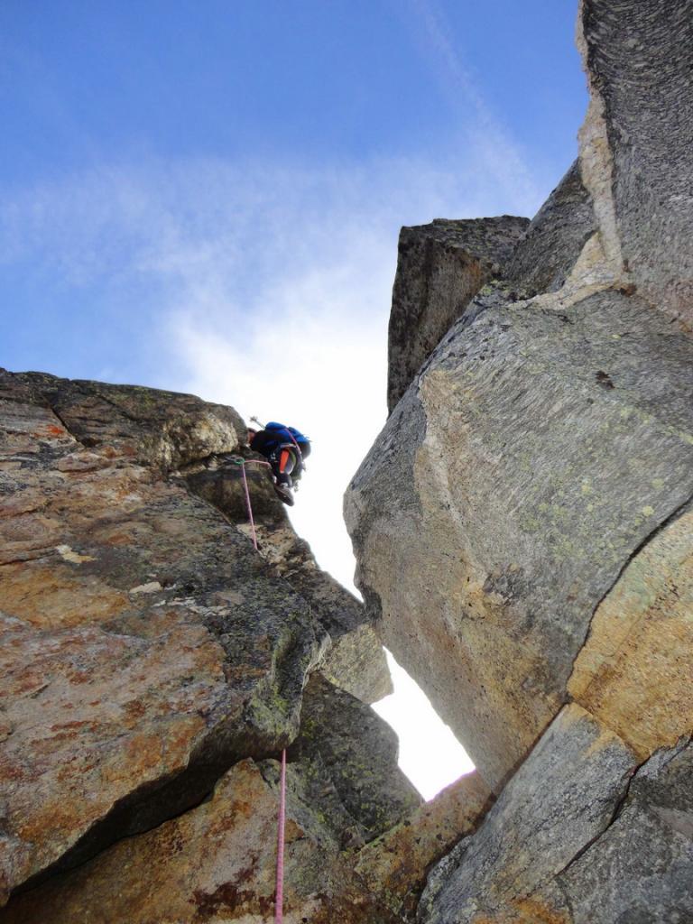 La cresta prosegue di nuovo più semplice e senza passaggi obbligati, superando un tratto in discesa di placche inclinate fino alla base del quarto risalto, che si vince lungo una bella fessura (IV+) e un diedro finale più semplice. Si prosegue senza difficoltà obbligate ma sostenute (molto III, qualche passo di III+), scontornando sulla sx un evidente gendarmino. Si raggiunge una specie di grosso camino-grotta, che conviene affrontare sulla parete di sx per poi uscire a dx e vincere la successiva ripida paretina (IV).