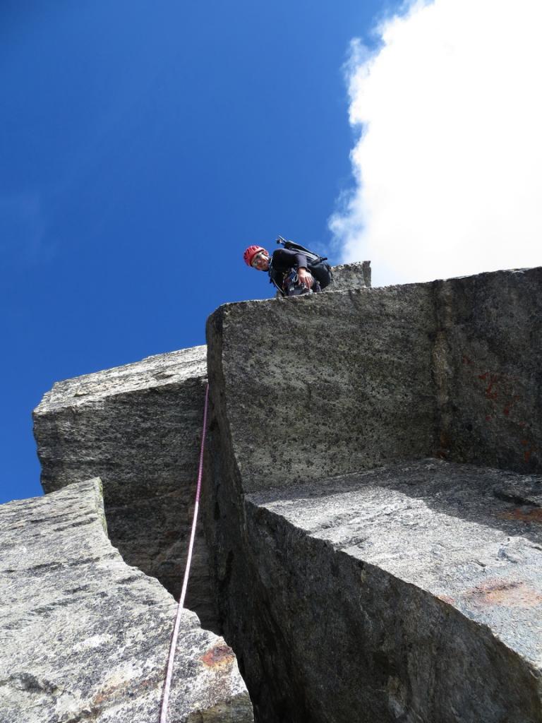 La cresta è spesso aerea, sempre divertente, con passaggi atletici su roccia generalmente buona; su un passaggio verticale di IV+ abbastanza umido e ostico, c’è un chiodo che andrebbe ribattuto, comunque ci sta un micro-friend.