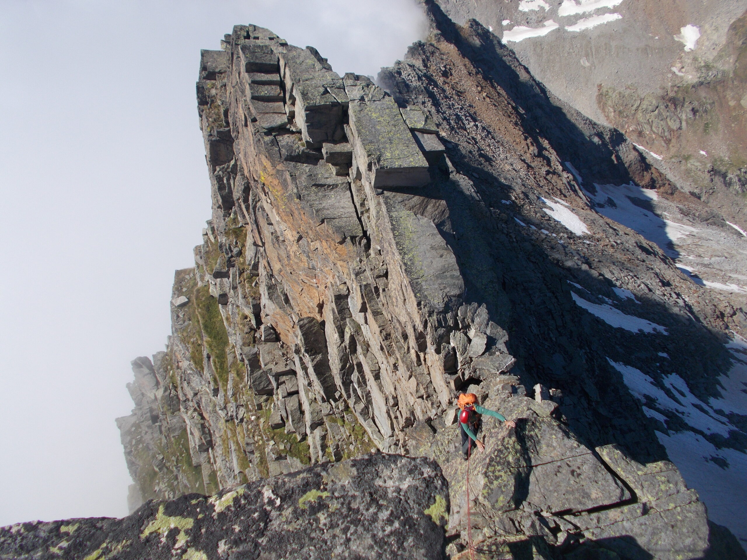 Alle 9 dal colletto 2984m pronti ad attaccare. Cresta lunga arcigna di solida roccia, come immaginavo, che supereremo praticamente per gran parte in conserva corta protetta, eccetto nelle impennate brevi ma nette con passi fino al IV+, dove giocoforza e’ stato necessario fare sicura.