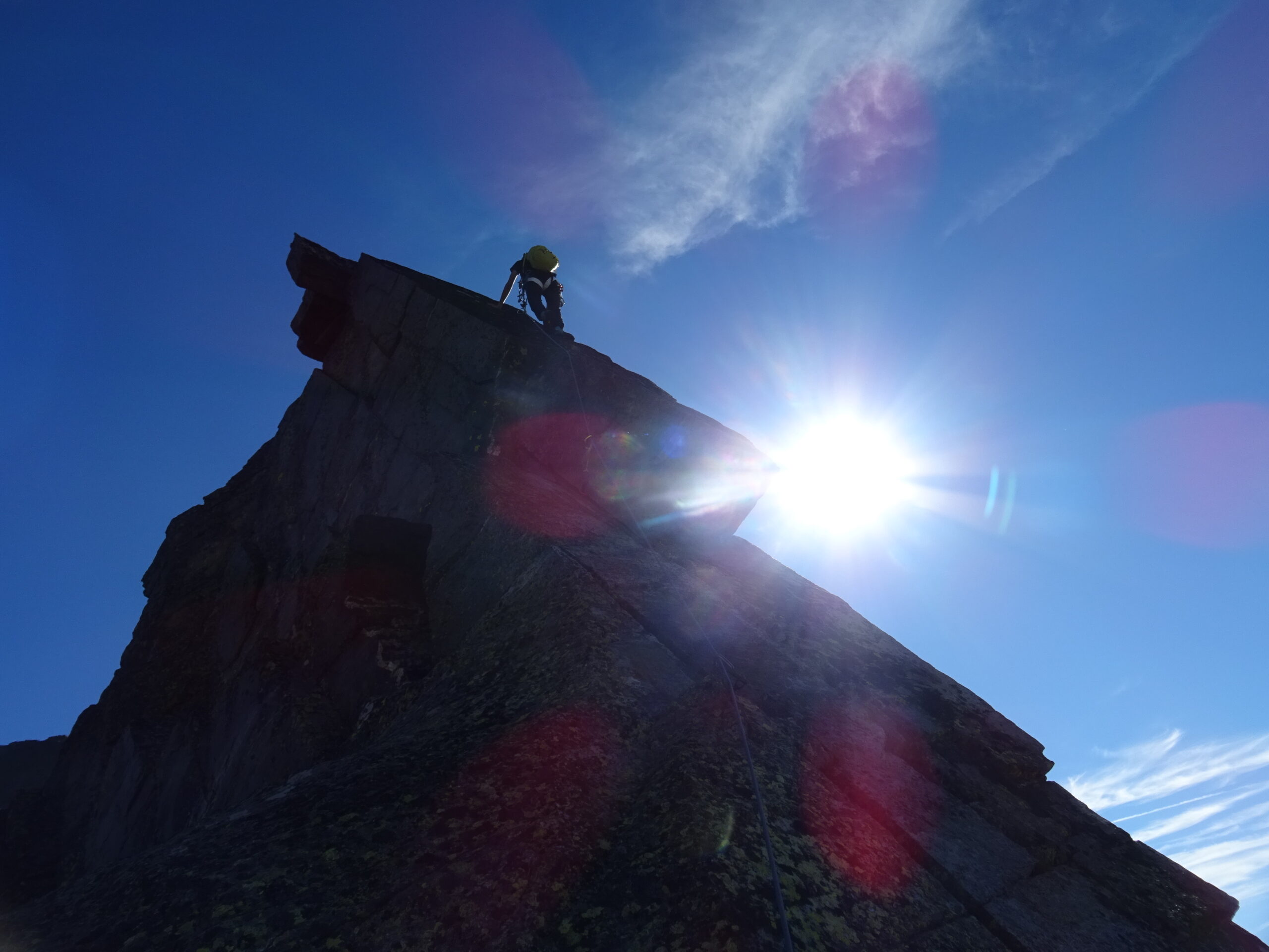 Approccio su sentieri ben tracciati fin oltre l’Alpe Bardoney, bivio per il bivacco ben segnalato così come il sentiero ma ponte assente (divelto dall’alluvione, si passa bene lo stesso sui massi). Bivacco nuovo, ben tenuto e con fontana all’esterno (extra lusso). Il mattino seguente partenza alle 7:15, la conca dell’ex ghiacciaio di Lavina si passa su nevai (no ramponi), dossi montonati e pietraie, scomode solo nell’ultimissima parte prima del colle (che si raggiunge in un’oretta scarsa). Prima parte di cresta molto divertente, affilata ed esposta. Noi abbiamo proceduto in conserva facendo 4 tiri per i 4 gendarmi di IV/+: tutti e 4 molto divertenti, su belle fessure e placche grippanti. Ci si protegge alla grande con una serie di friend (0.3-2BD) e magari qualche rinvio per allungarli, utili cordoni lunghi per attrezzare soste su spuntoni, sufficiente una corda da 30m (i tiri non superano mai i 15-20m). Attenzione solo ad una losa pericolante incastrata nella fessura del penultimo tiro. La seconda parte della cresta è decisamente più discontinua (nel senso con risalti più brevi ma comunque sempre sul III/+), meno obbligata e un po’ più noiosa, anche a causa della qualità più scadente della roccia. Nell’ultima parte alcuni risalti ripidi vanno saliti stando sul fianco sx della cresta ma sconsiglio di andare a prendere il canale a sx, sembra un bel troiaio. Carini comunque il tratto della grotta-camino e il castelletto sommitale. In cima alle 12.10, con la solita nebbia lato Canavese ma belle schiarite lato VdA. Discesa legati fino al colletto (qualche tratto delicato) e poi ancora fino in cima alla Nord (bella roccia e passaggi max II), da lì in giù è via via più facile fino ad arrivare all’ultimo risalto ripido che precede il bivacco: siamo passati a dx in un diedro-canale marcio per poi sbucare sotto cresta all’altezza del bivacco (contare 1h30 dalla cima). Discesa tranquilla a valle, pochissima gente fino all’alpe Bardoney e poi beaucoup de monde.