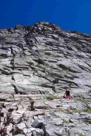 salire il terrazzo sopra il nevaio appena a sinistra di un evidente diedro ,seguire divertenti placche raccordate per due tiri di corda (III-IV).Con arrampicata più facile portarsi sotto l’evidente sperone posto sulla verticale, risalirlo sino in cima per diedri, lame, placche (IV-IV+).