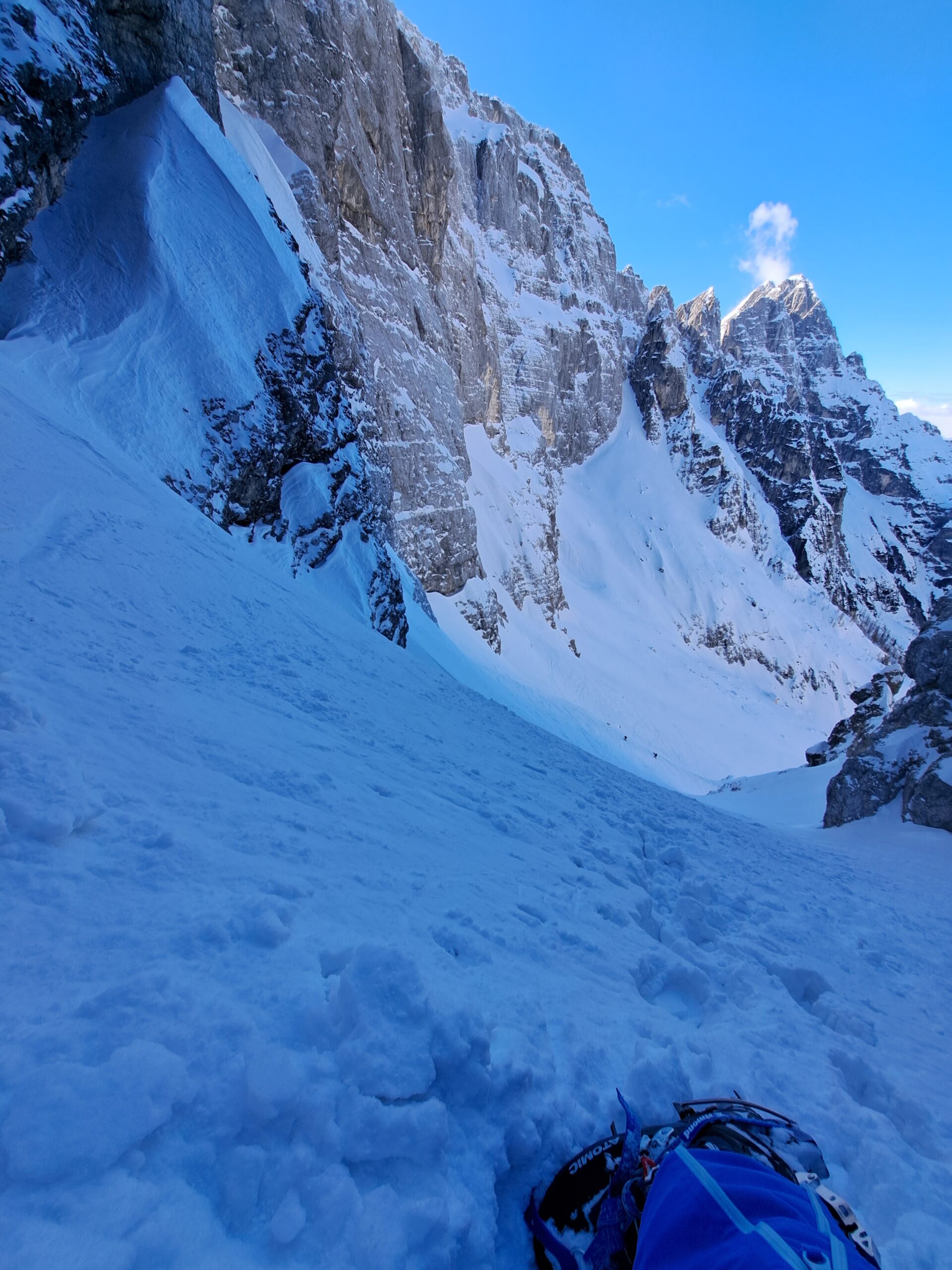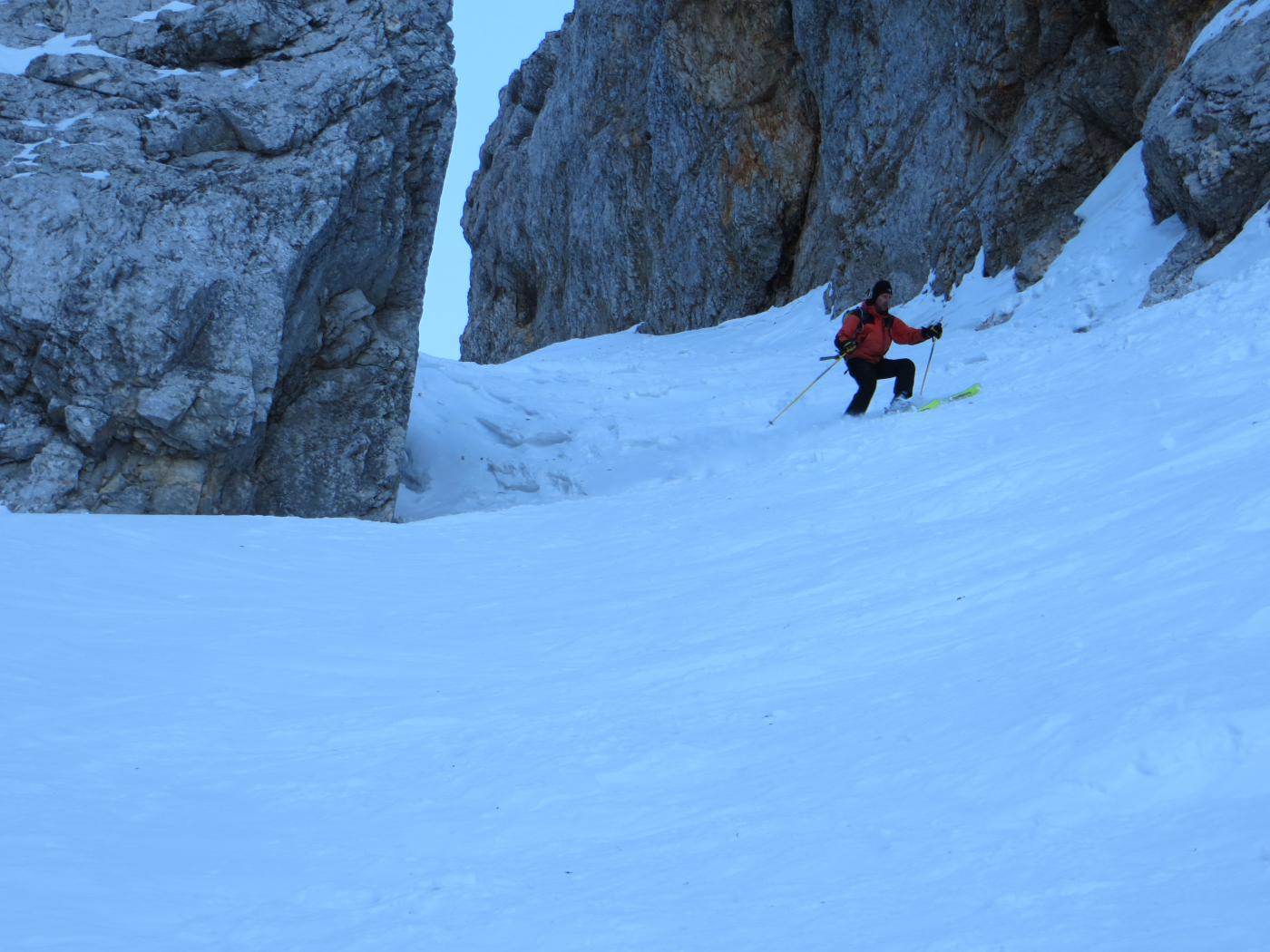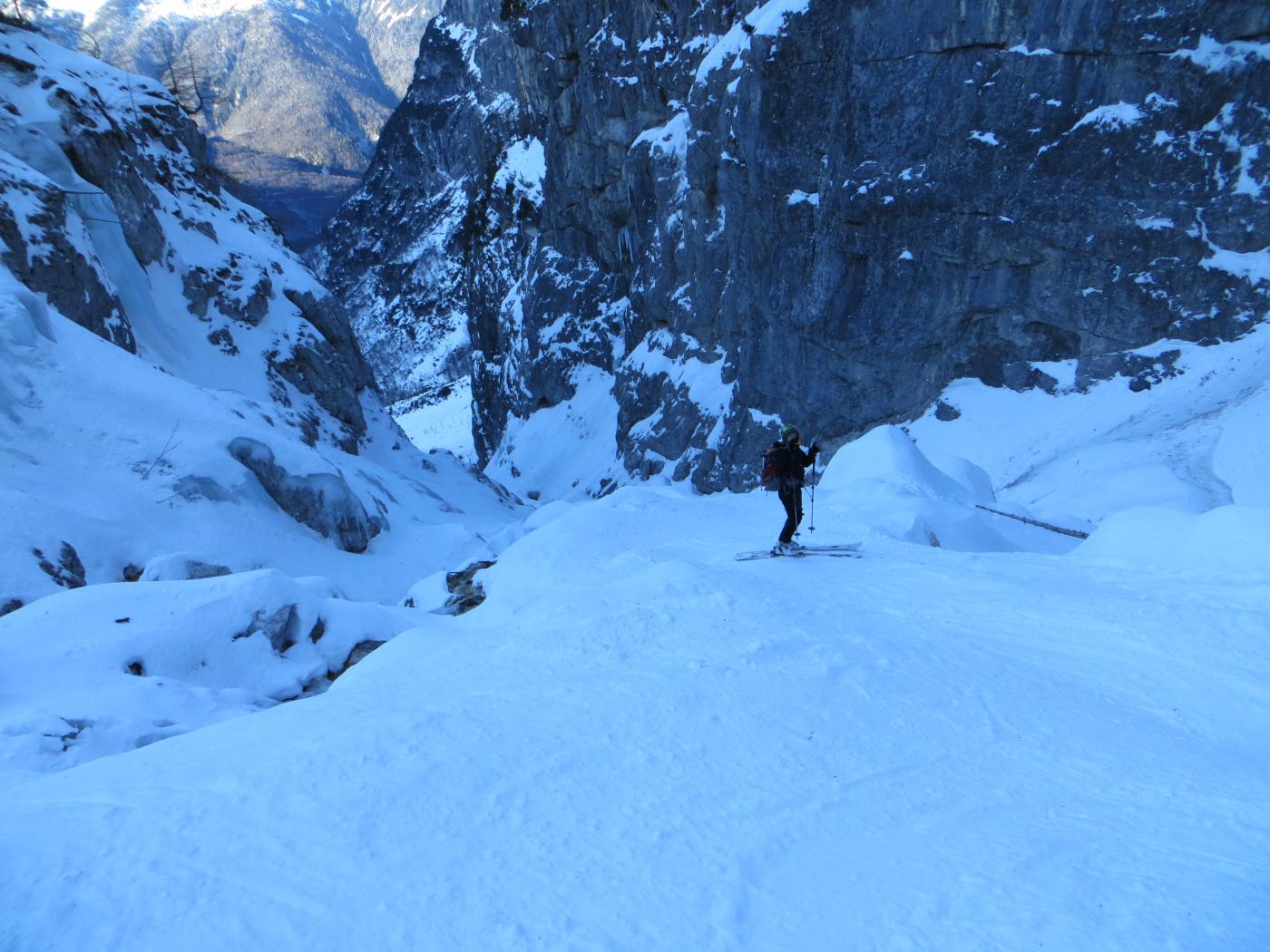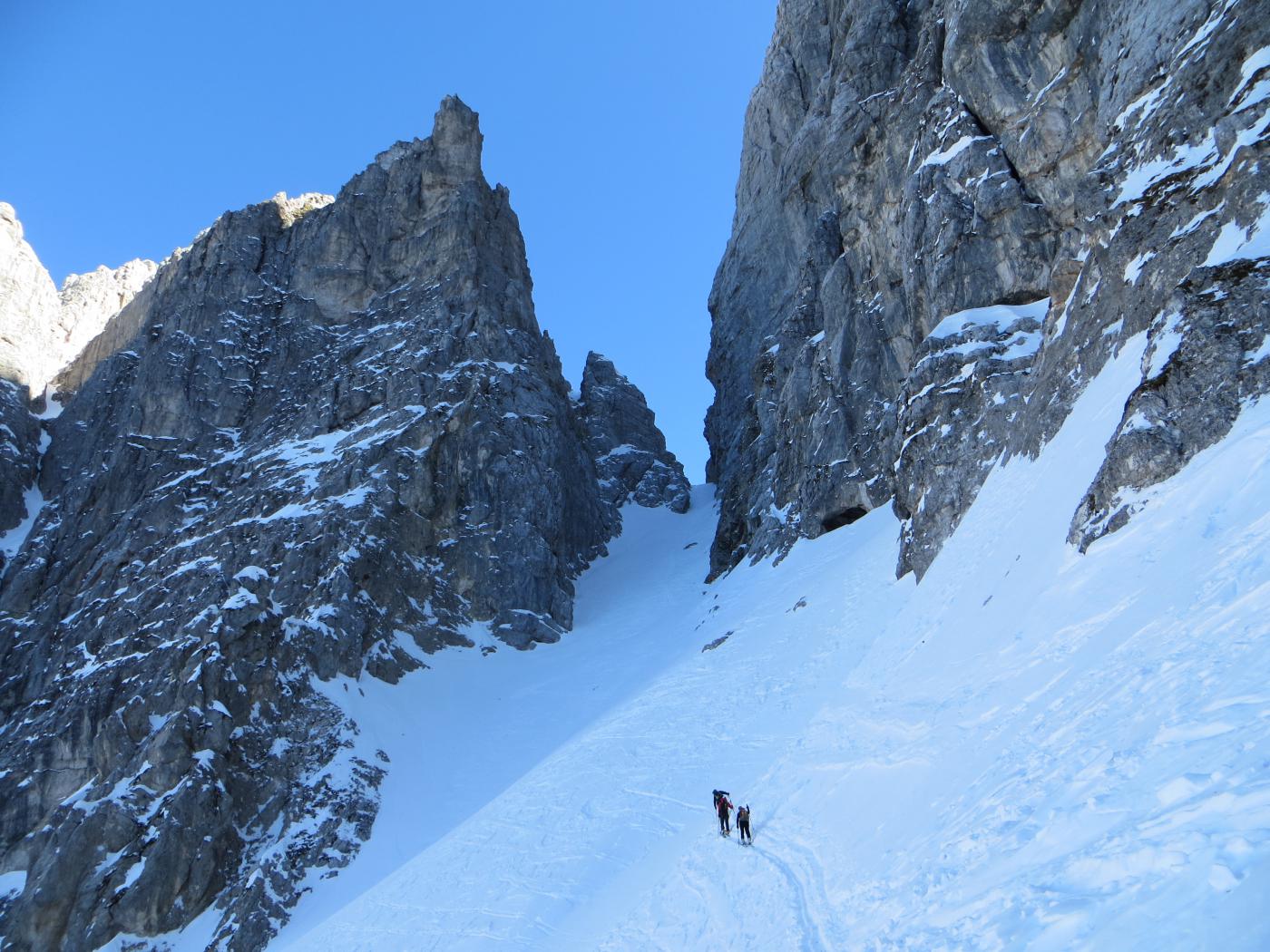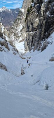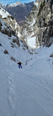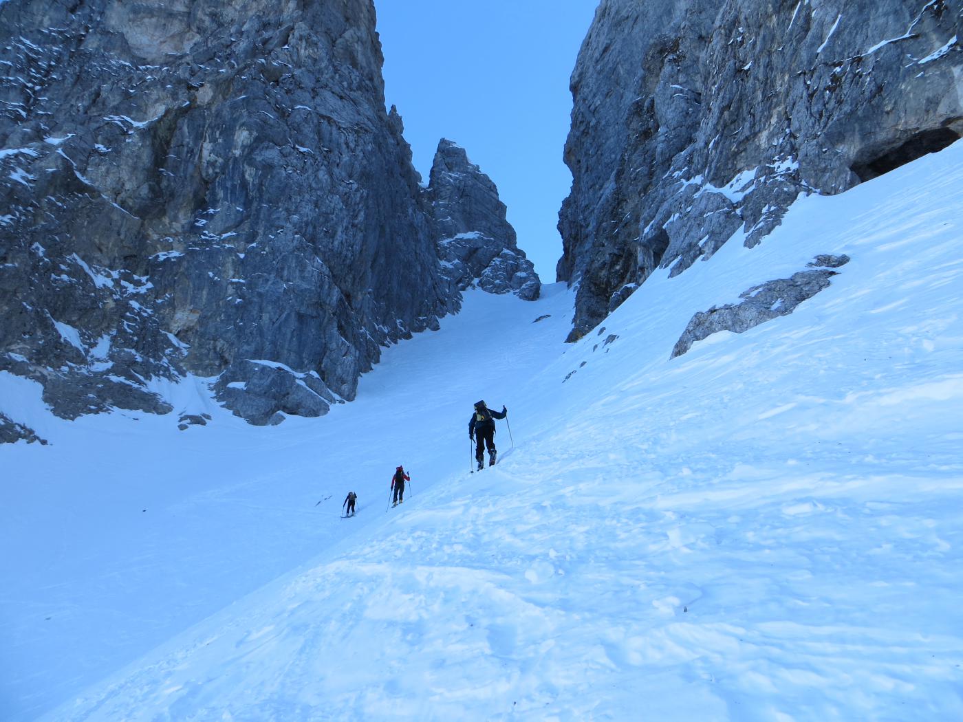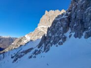 Si risale un ampio pendio la cui pendenza aumenta progressivamente finchè si trasforma nella parte finale in un ripido canale.