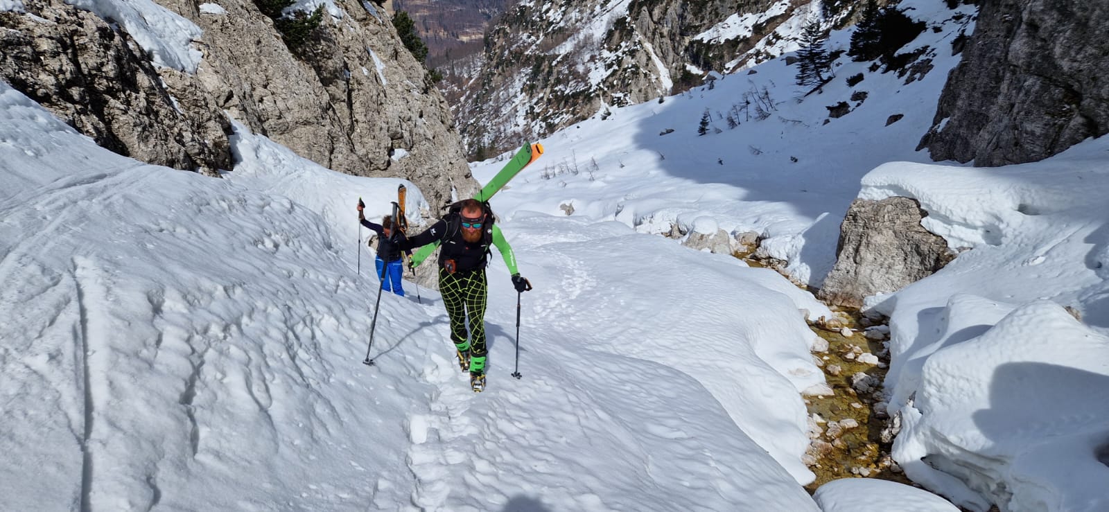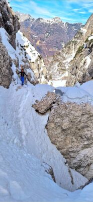 Al termine della conca della bassa Spragna,prima di una rampa rocciosa,si lascia il sentiero che sale al Bivacco Mazzeni e si prosegue verso sx fino alla base di una forra che mette in comunicazione la bassa con l’alta Spragna.