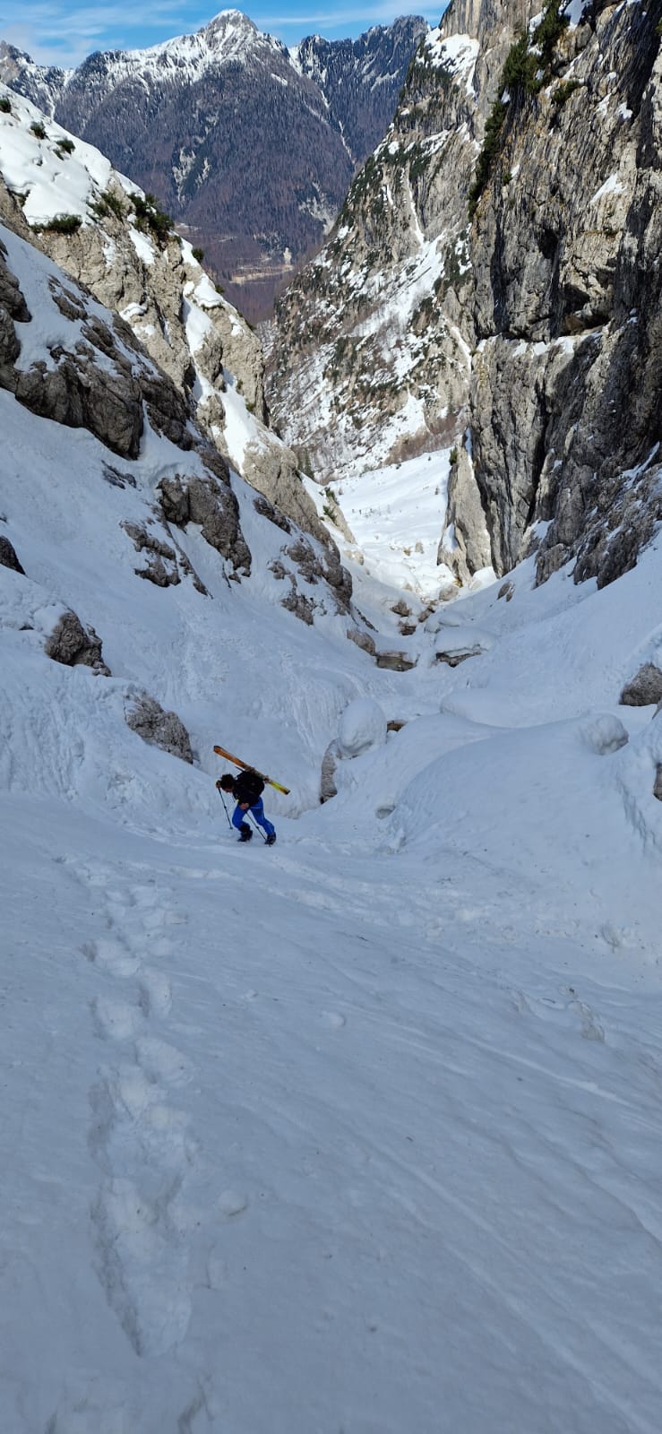L'ampia conca della Spragna, racchiusa ad ovest dallo Jof Fuart e ad est dalla catena meridionale del Montasio, presenta una serie di canali particolarmente apprezzati dagli scialpinisti; quello che conduce alla Forcella e' il più ampio e solitamente più in buone condizioni.Impegnativo dalla forra della Spragna in su;la pendenza della parte alta non e' da sottovalutare OSA). Gita da effettuarsi con condizioni di stabilita' del manto nevoso.