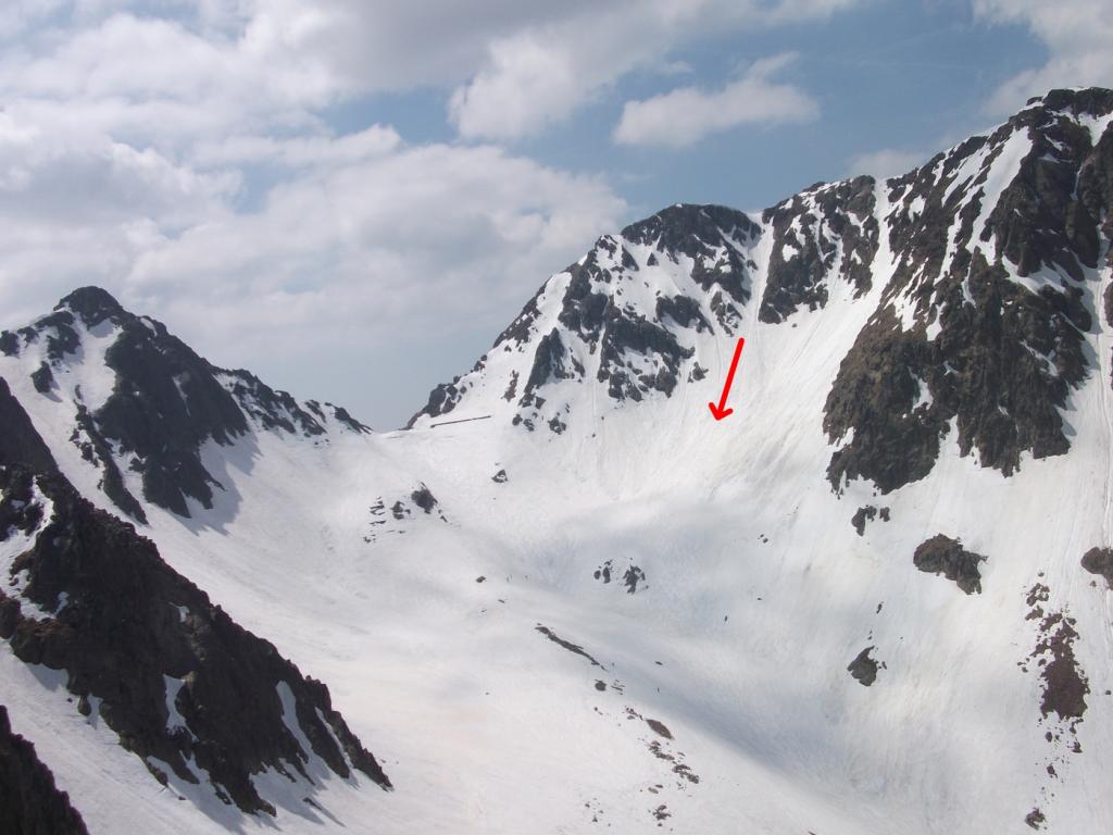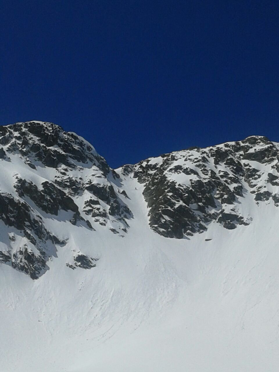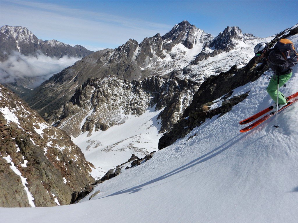 Discesa: lungo la via di salita oppure per il canale NE che inizia poco oltre la cima e che reimmette nel vallone a valle del colle di Ciriegia. Si tratta di un breve canale di 150/200 metri di dislivello con una partenza sui 45° ed una certa esposizione su un grosso masso affiorante, superato il masso il canale gira e la pendenza diminuisce sui 40°.