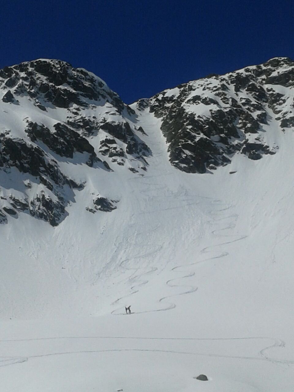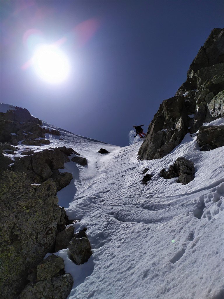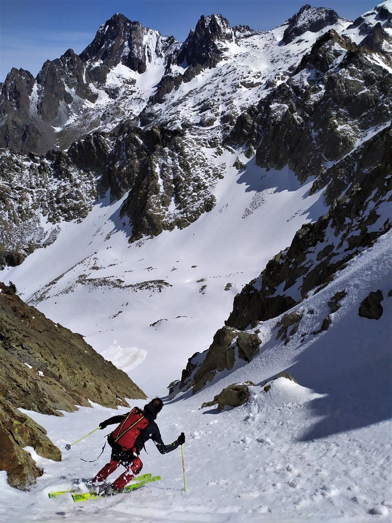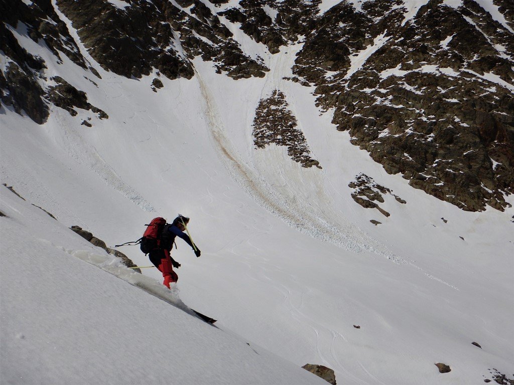Discesa: lungo la via di salita oppure per il canale NE che inizia poco oltre la cima e che reimmette nel vallone a valle del colle di Ciriegia. Si tratta di un breve canale di 150/200 metri di dislivello con una partenza sui 45° ed una certa esposizione su un grosso masso affiorante, superato il masso il canale gira e la pendenza diminuisce sui 40°.