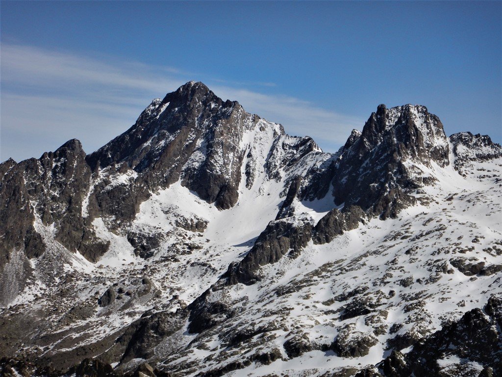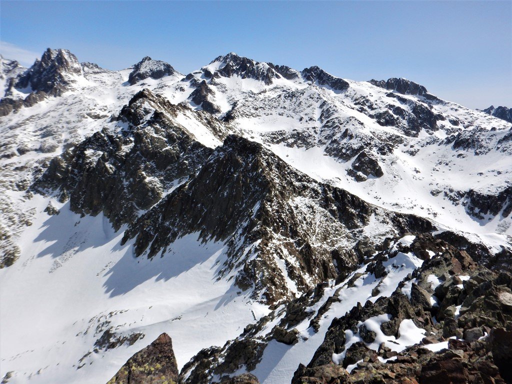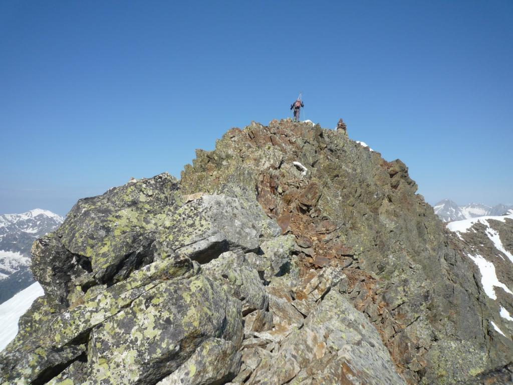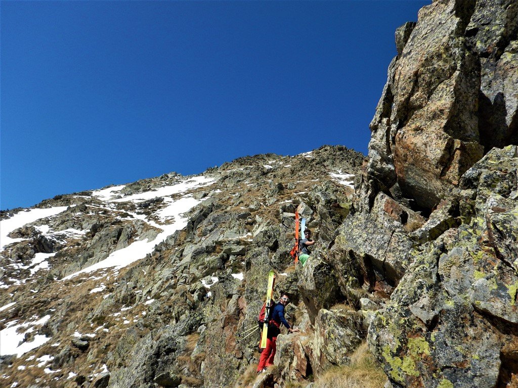 Da qui l’itinerario si fa più impegnativo: svoltando a dx, si superano i resti di una casermetta e si risale, in parte con gli sci ed in parte a piedi, la ripida cresta che conduce alla cima.